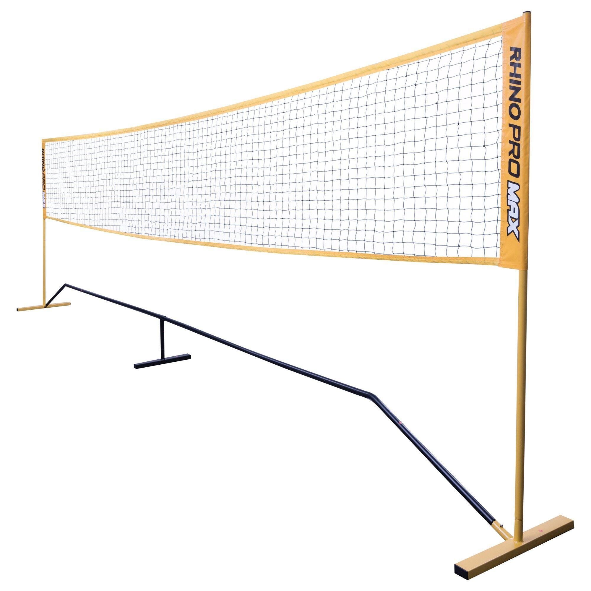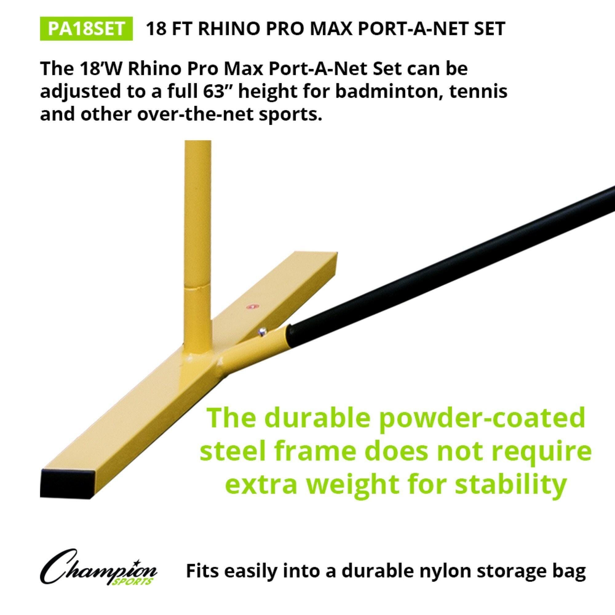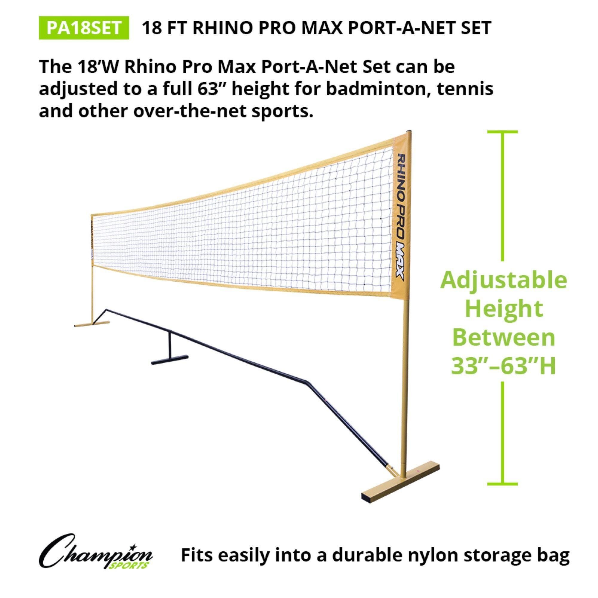 The Champion Sports Rhino Pro Max Port-A-Net Set is a must-have for exciting games on and off the court. The 18-foot net can be set to a full 33 to 63 inches in height for badminton, tennis, and other over-the-net sports. Its durable powder-coated steel frame requires no extra weight for stability, and the adjustable nylon strap at the top ensures quality net tension.Features