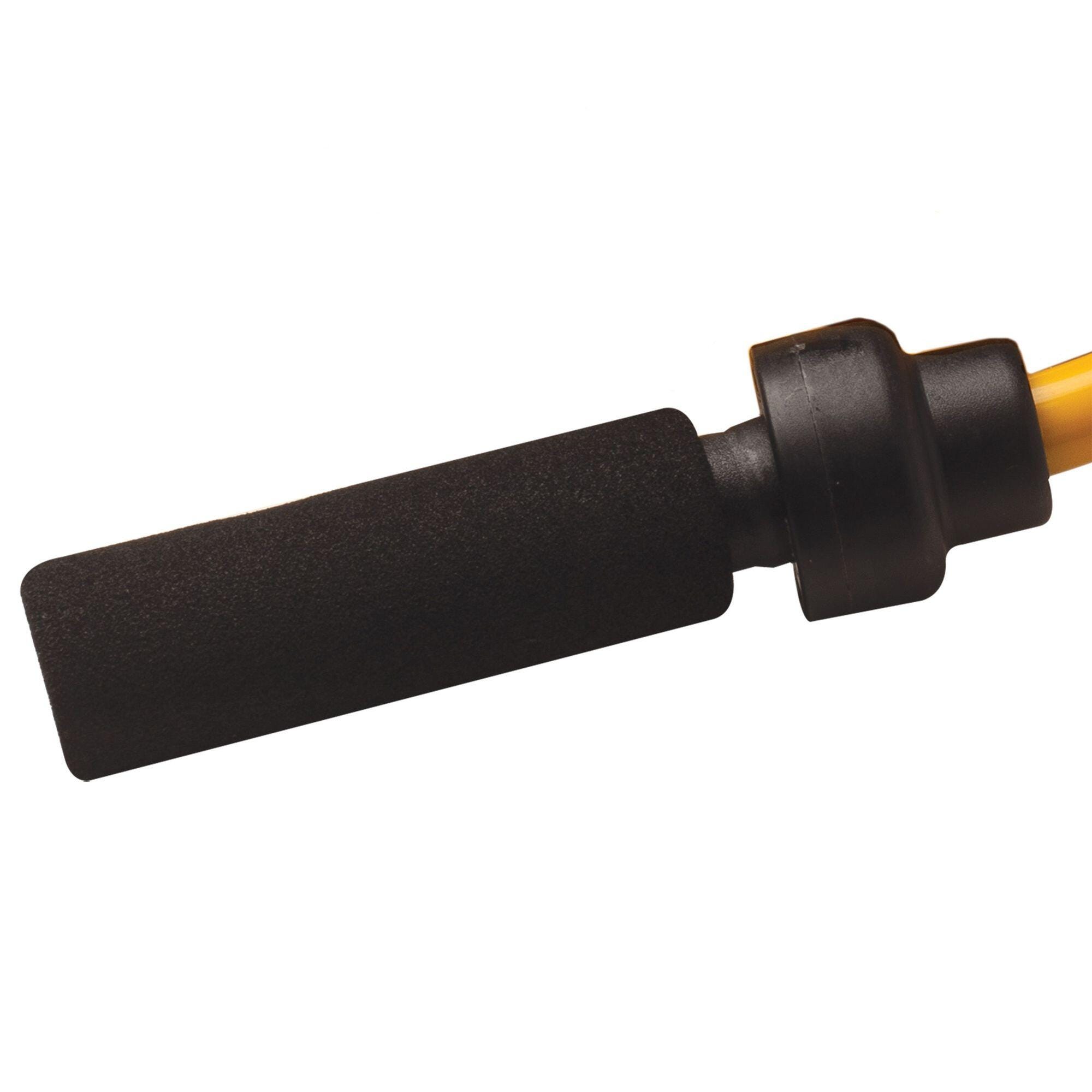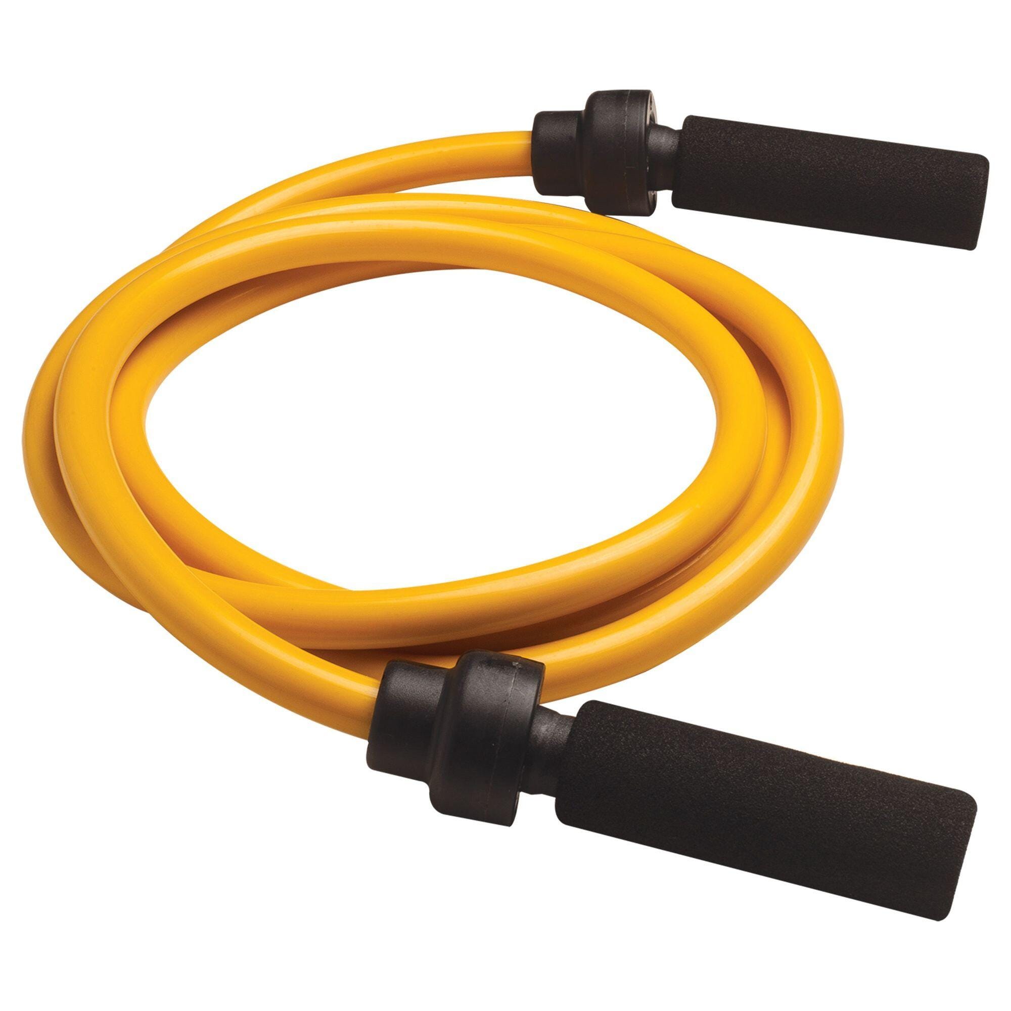 Solid rubber rope with foam covered swivel ball bearing handles. Great for cardiorespiratory endurance. 9 feet Long, 3 pound, Yellow.