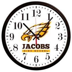 Custom logo face clock has easy to read Arabic numerals, black hour and minute hands and a red second hand.