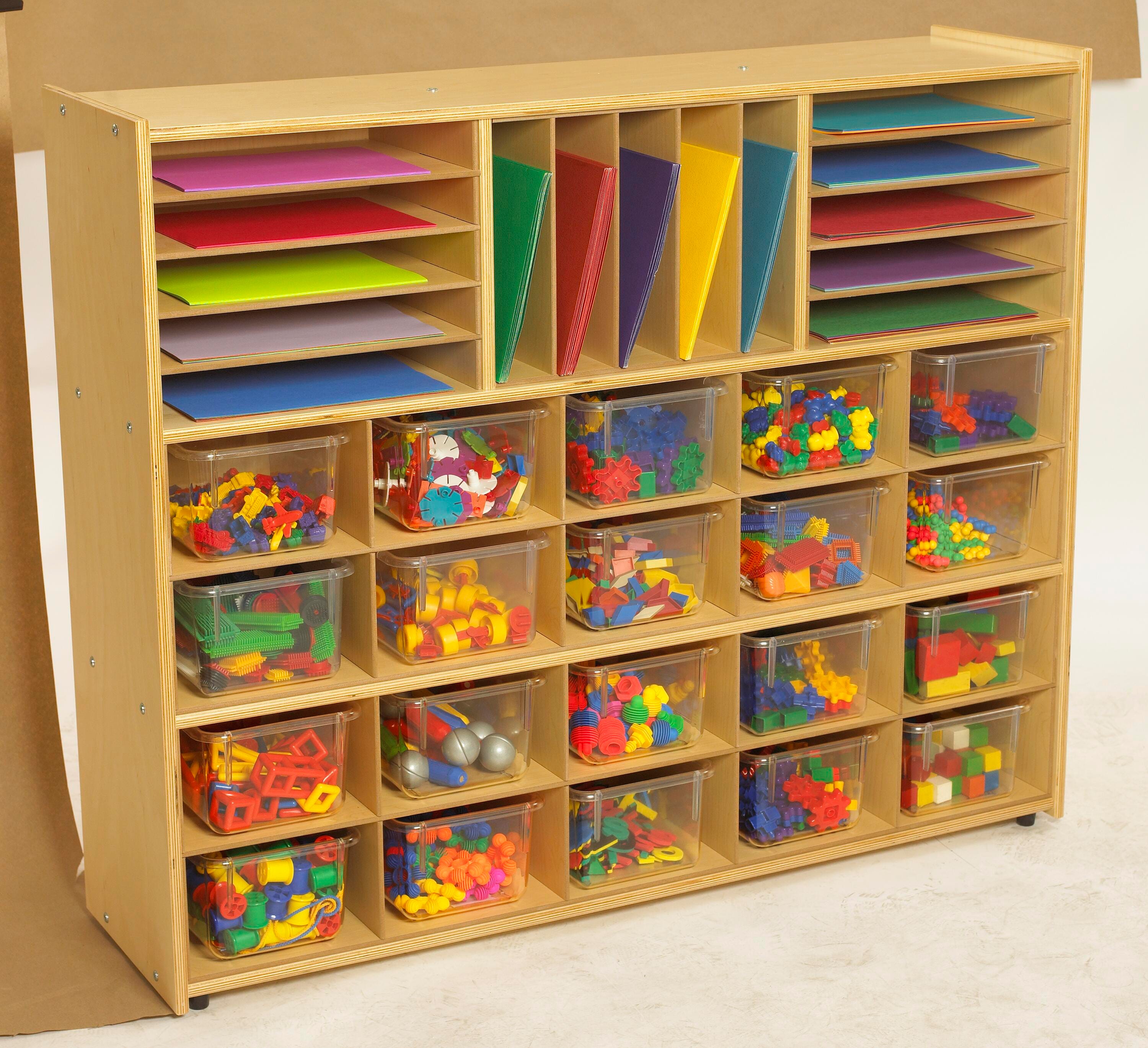 The Childcraft® ABC Furnishings Storage Unit offers ample cubby space to store books, games, supplies, and more. The open storage design allows children to independently access their belongings, while the included 20 see-through trays provide easy organization for smaller items. Each bin measures 7-3/4 W x 12 D x 5-1/4 H inches. Top inserts help keep papers, mail, and homework organized. Crafted from birch plywood with a durable, stain-resistant finish, this cabinet is built to withstand daily use in busy learning environments. Measures 48 W x 13 D x 40 H inches. Assembly required.Features