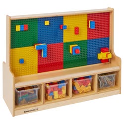 Childcraft® Dual-Sided Building-Brick Activity Center offers a perfect blend of entertainment and organization for children. One side features a multi-colored brick grid for preschool-sized building blocks, while the other side provides a magnetic dry erase board for drawing, writing, and problem-solving. The play unit includes four removable clear trays for convenient storage of bricks, markers, or other supplies. This activity center promotes teamwork and creative exploration, making it ideal for classrooms, daycares, or playrooms. Comes fully assembled. The compact activity wall measures 39-1/2 W x 14-1/4 D x 30 H inches.Features