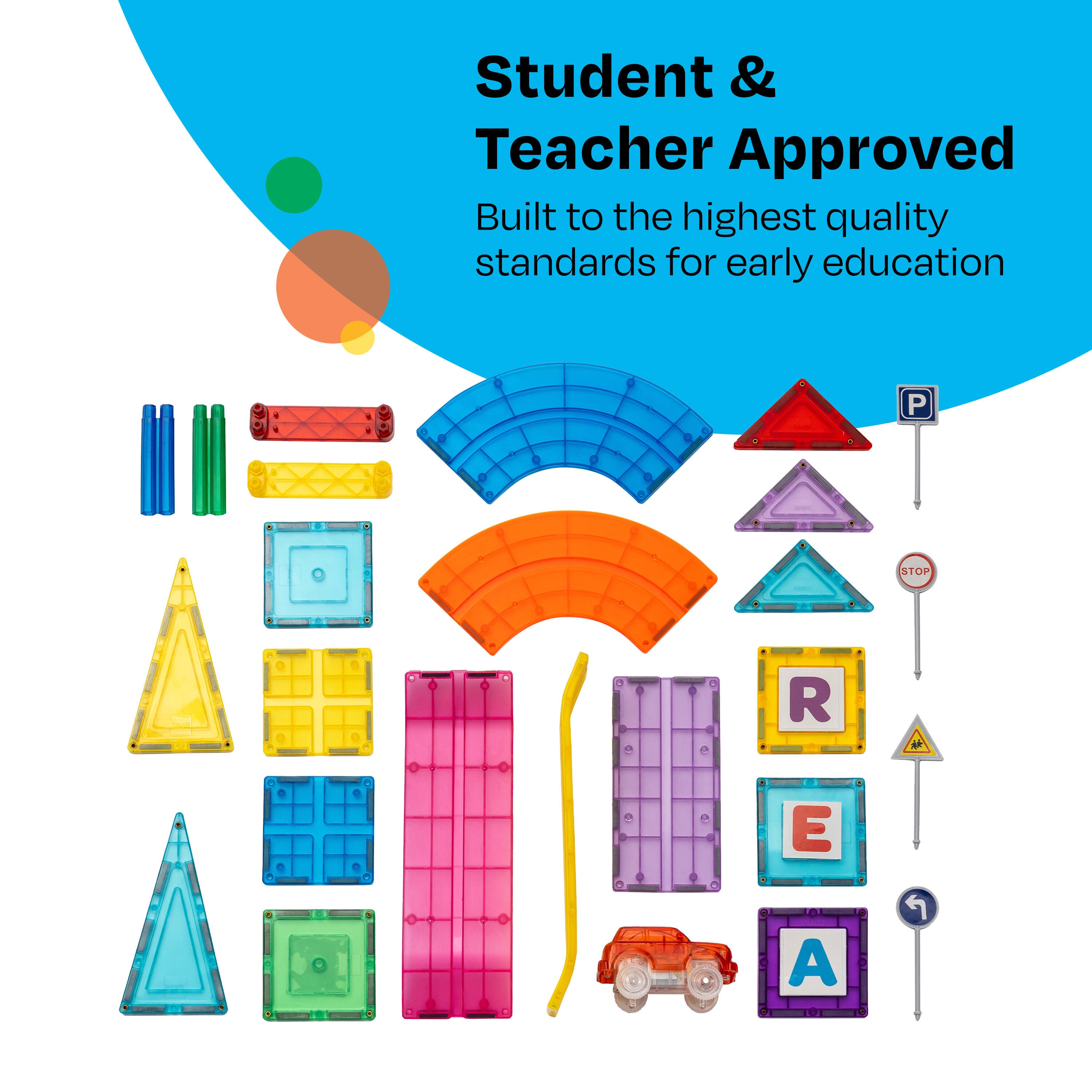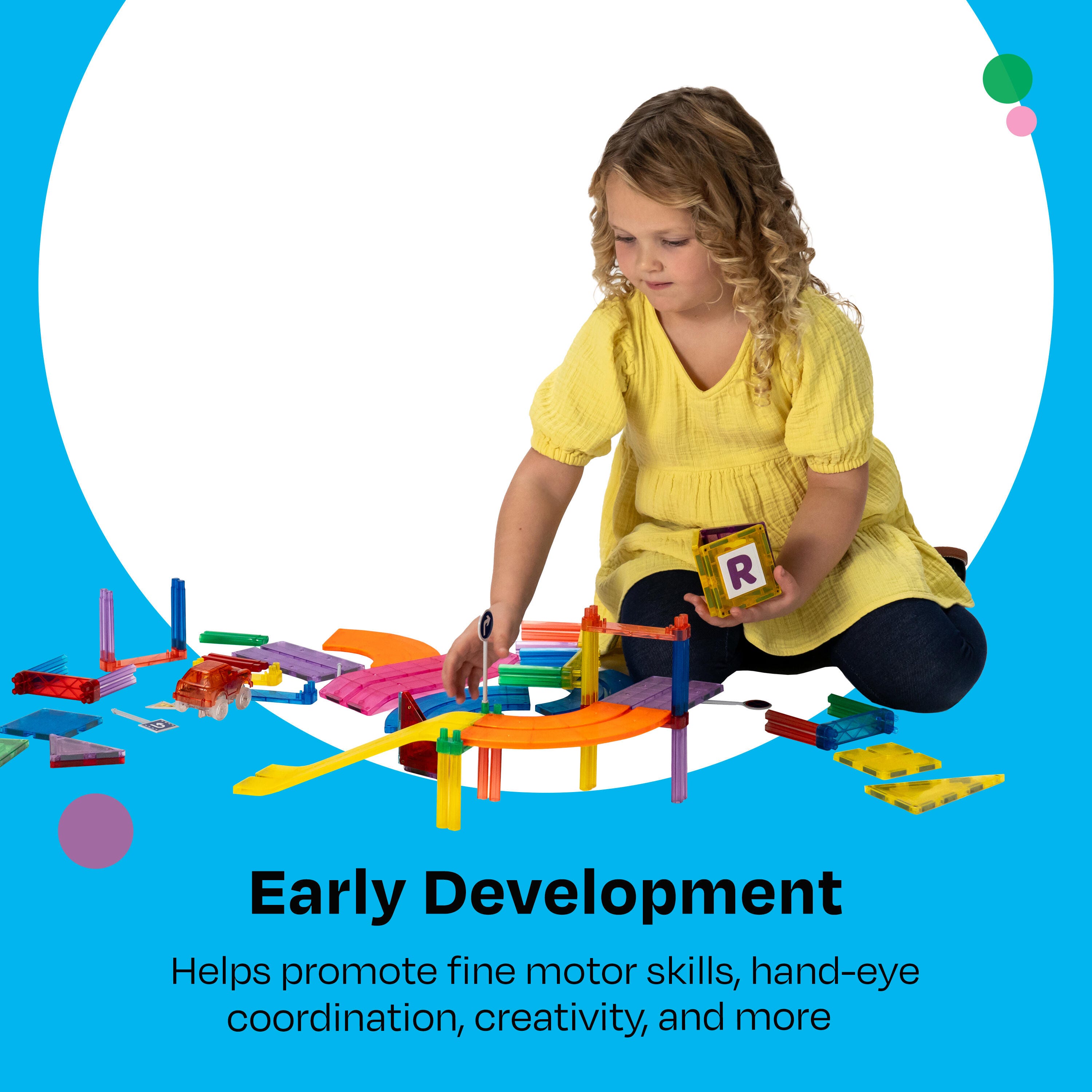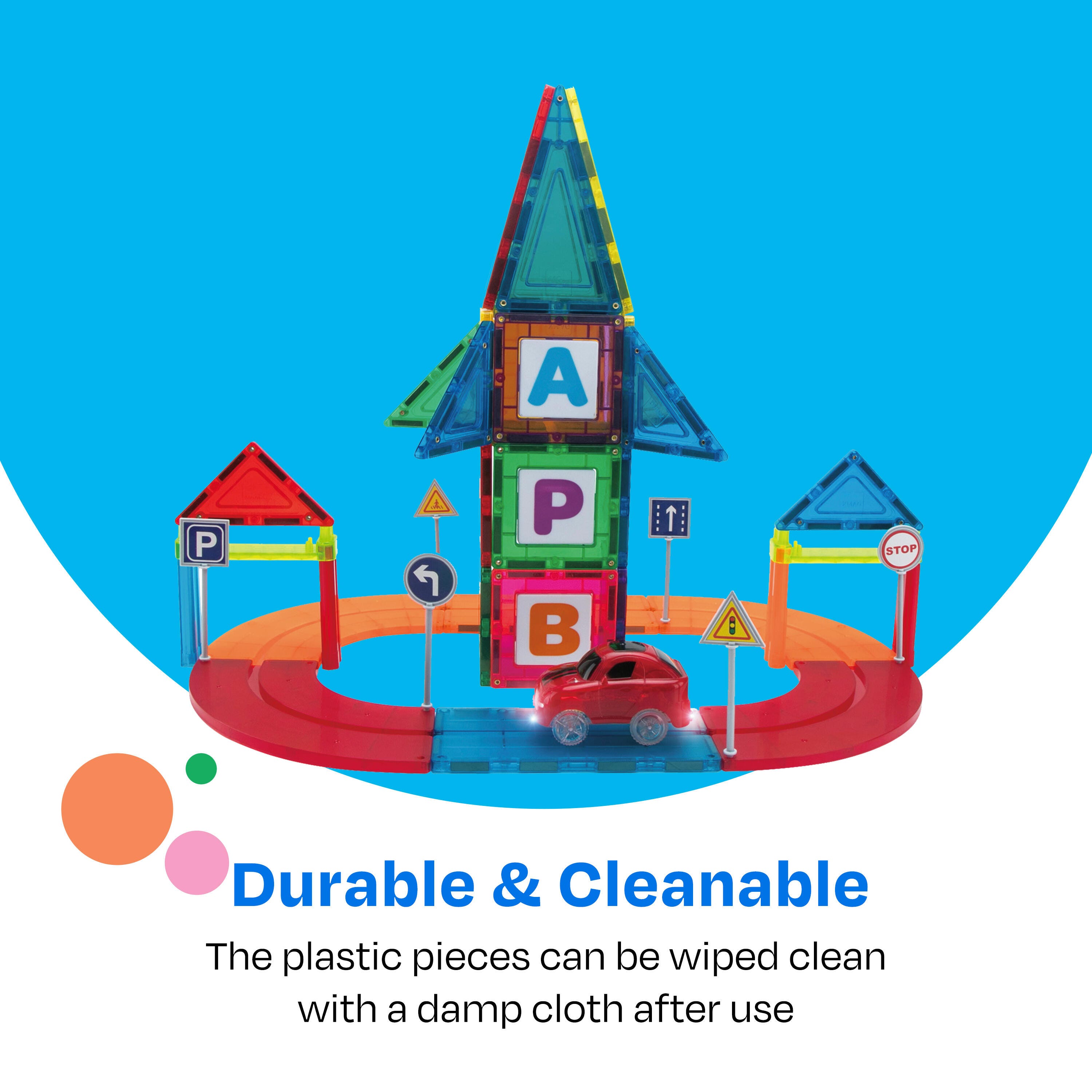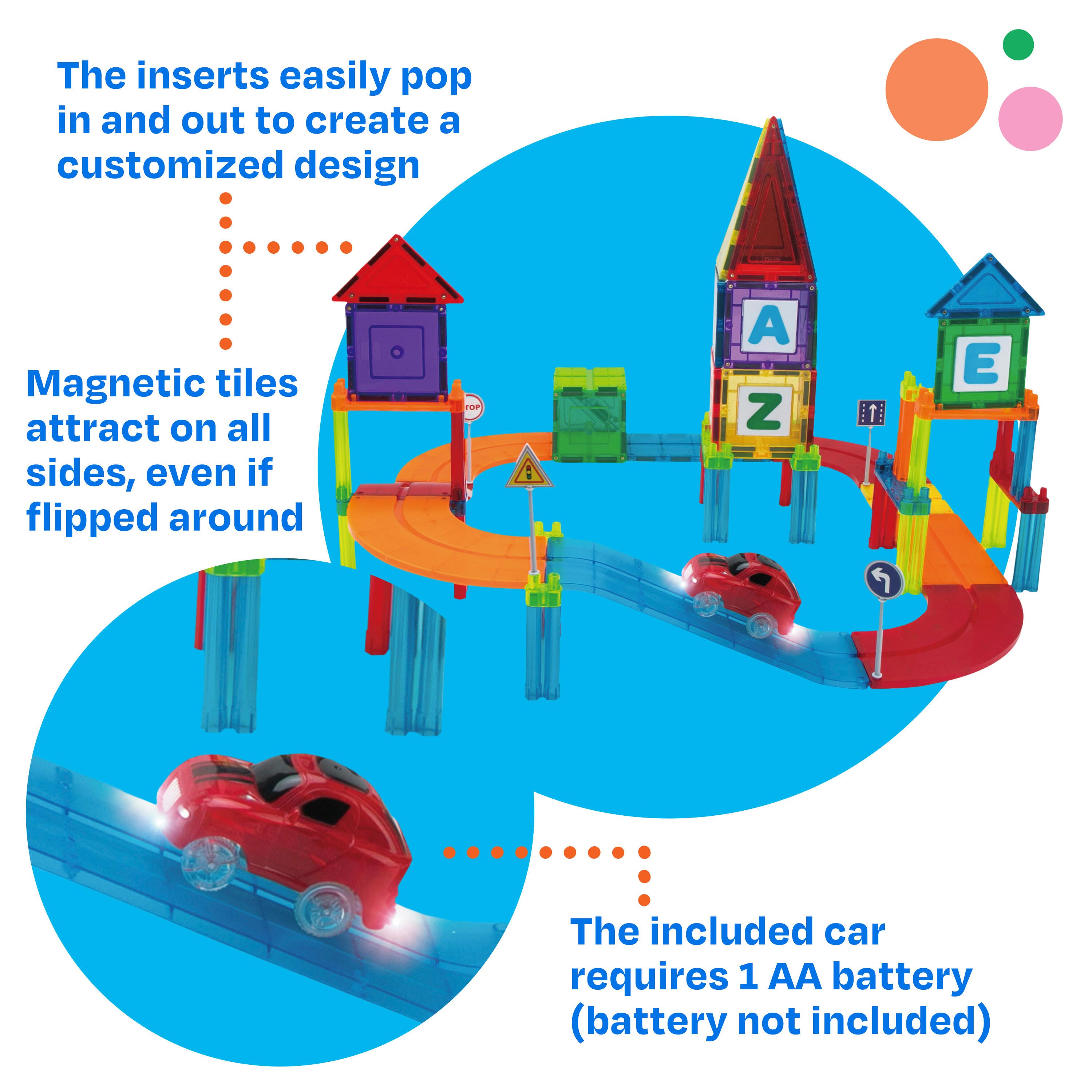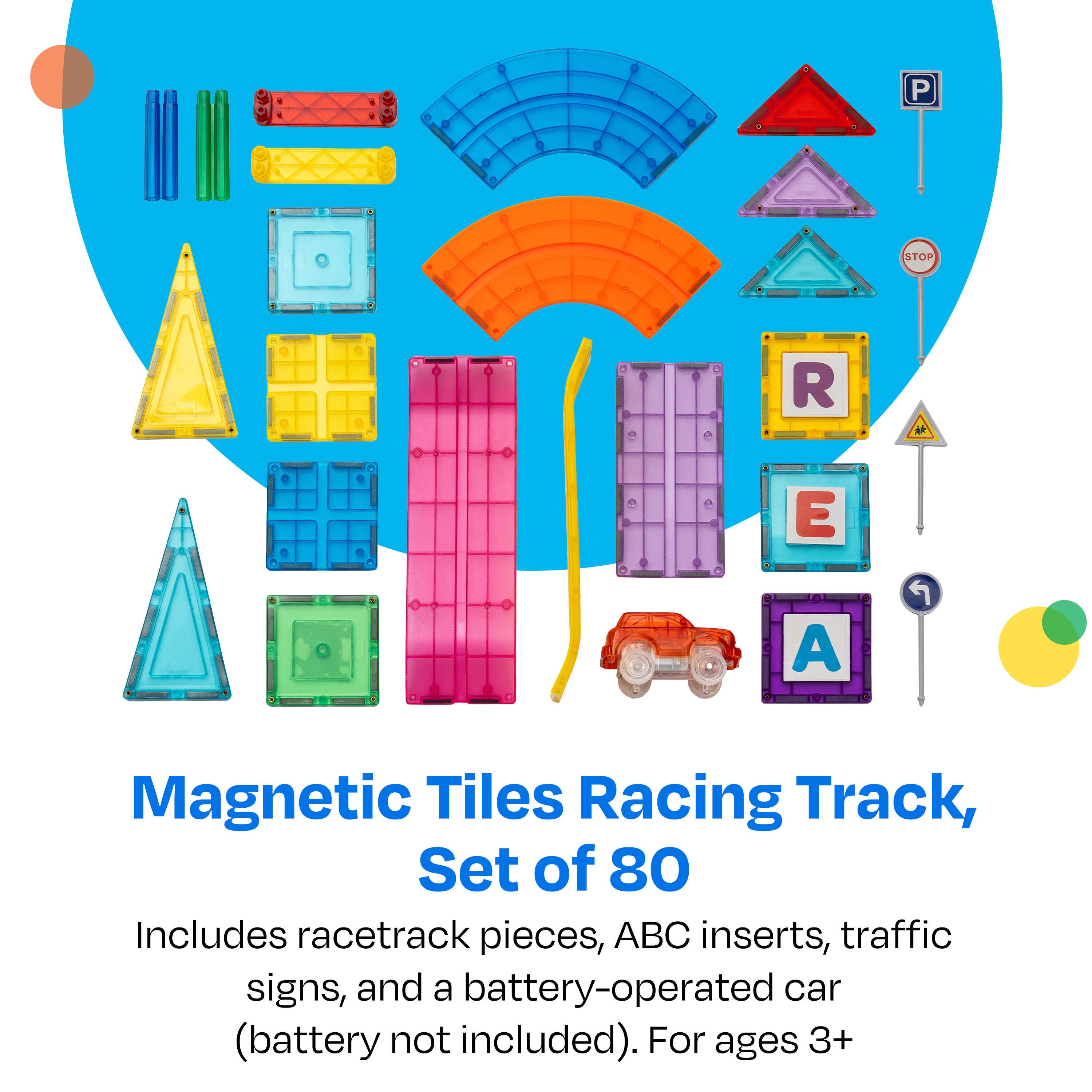 Childcraft® Magnetic Tiles Racing Track is an exciting way to encourage imaginative play and learning. This set has 80 pieces, including translucent magnetic tiles, alphabet inserts for letter-learning fun, various traffic signs, and a battery-operated car for exciting adventures. The magnetic tiles attract on all sides, making it easy to assemble a custom racetrack that encourages creativity, problem-solving, and coordination. Designed for ages 3+, this magnetic play set is perfect for screen-free fun and hands-on skill building. Batteries not included.