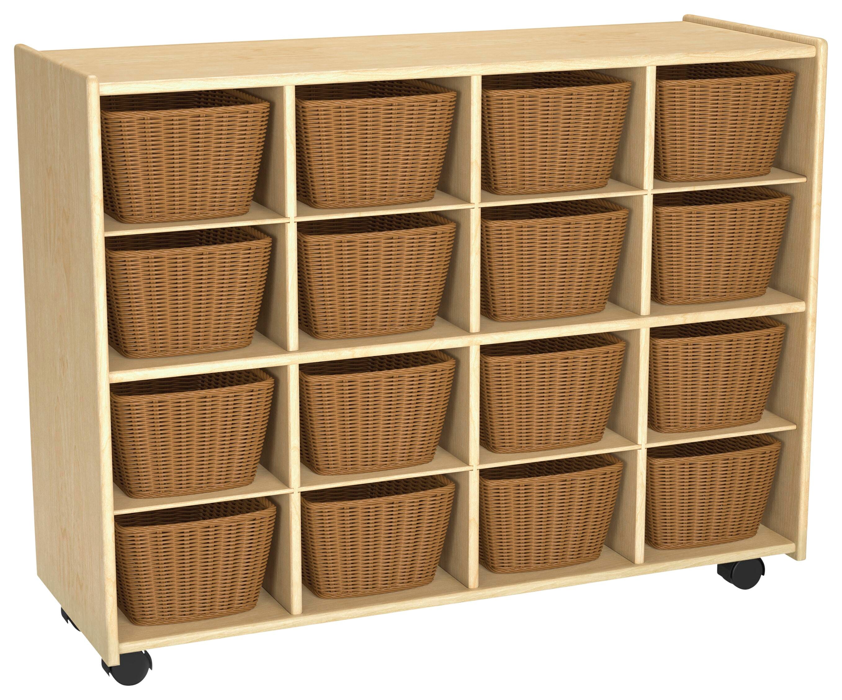 Childcraft Mobile Cubby Unit with Locking Casters, 16 Wicker Baskets, 38-5/16 x 14-1/4 x 30 Inches
