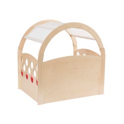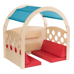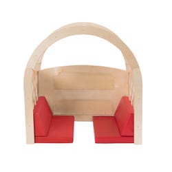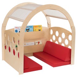 The Childcraft® Reading Nook provides a comfortable retreat for young learners to explore books and unwind. Designed for classrooms, libraries, and early learning spaces, this wooden reading nook features a sturdy frame with side cutouts for teacher visibility, two built-in bookshelves for easy access to reading materials, and a soft canopy for a calming atmosphere. The included red seat cushions offer extra comfort, making this the perfect spot for independent reading or small group activities. This reading nook with seating comes with two interchangeable canopies. The full unit measures 49-1/2 W x 37 D x 50 H inches. Assembly required.Features
