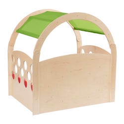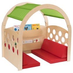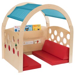 The Childcraft® Reading Nook provides a comfortable retreat for young learners to explore books and unwind. Designed for classrooms, libraries, and early learning spaces, this wooden reading nook features a sturdy frame with side cutouts for teacher visibility, two built-in bookshelves for easy access to reading materials, and a soft canopy for a calming atmosphere. The included red seat cushions offer extra comfort, making this the perfect spot for independent reading or small group activities. This reading nook with seating comes with two interchangeable canopies. The full unit measures 49-1/2 W x 37 D x 50 H inches. Assembly required.Features