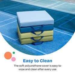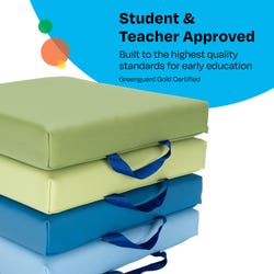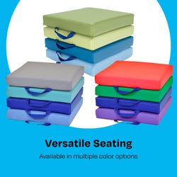 This Childcraft® Square Cushions pack features 4 floor cushions for classroom and indoor/outdoor use. The square seat cushions are soft and durable, giving students a comfy spot to sit anytime and anywhere. Whether playing, learning, or reading, take a cushion on the go. An attached carrying handle provides easy transportation and handling when moving from one spot to another. Use the comfy cushions indoors or outdoors as needed, and put them away when no longer in use. They’re easy to wipe clean to promote long-lasting use and hygiene. The Greenguard Gold Certification ensures furniture items are low emitting and meet or exceed the industry standards for classroom use.Features
