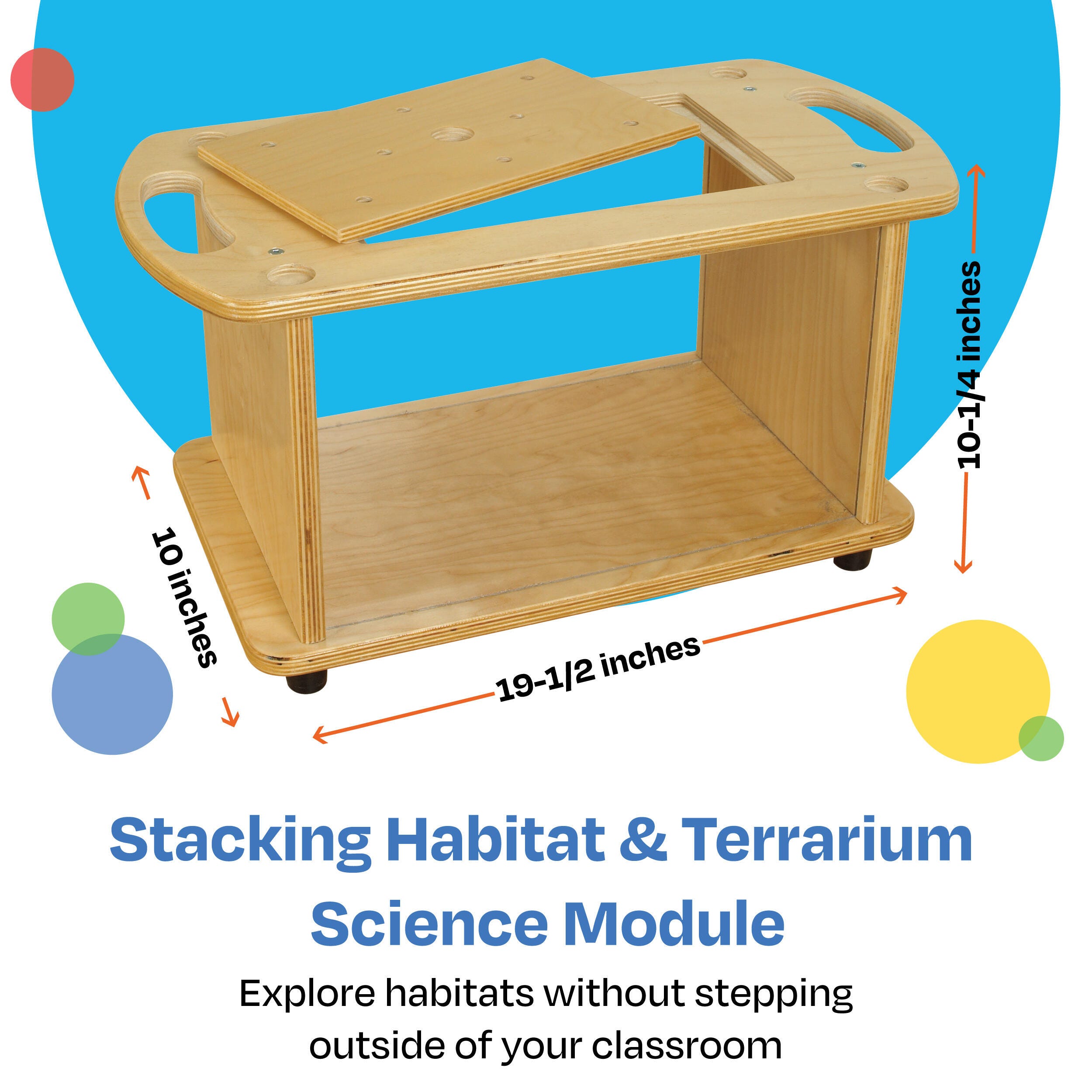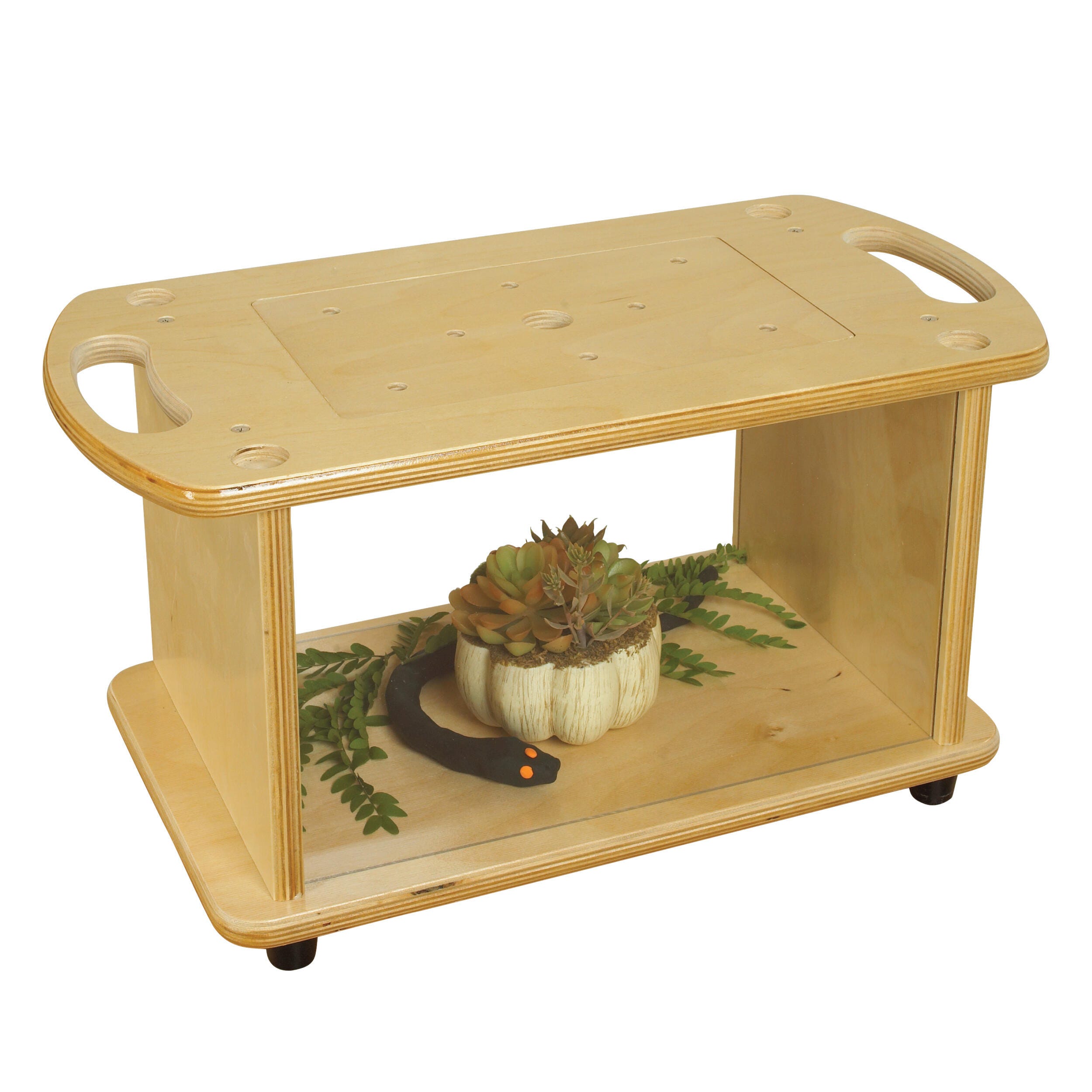 Childcraft® Stacking Habitat and Terrarium Science Module Sensory Table includes a removable lid and clear sides for easy viewing. Use the wooden sensory table for hands-on learning and ecosystem exploration. The portable science cart features a sensory experience for young children, and has smooth handles for easy carrying and feet that nest for stacking with our other small tables. The interactive activity center is great for building fine motor skills and developing sensory stimulation. Crafted for long-lasting use, this science station is made of durable birch plywood that’s easy to wipe clean. Comes fully assembled. This sensory table measures 19-1/2 W x 10 D x 10-1/4 H inches.