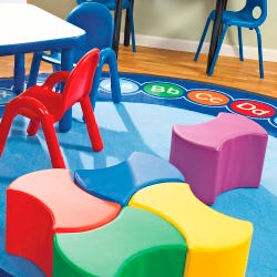 This colorful modular seating set interlocks, and can be arranged in a variety of ways. Whether your playroom is better suited to one long line, as individual seats, or as seats with a center ottoman, you can easily move and shift to fit your space. Set includes 6 seats with a 10-inch seat height, perfect for toddlers and young children. Each seat measures 14-1/2 W x 10-1/4 D x 10 H inches. For ages 2 to 4.