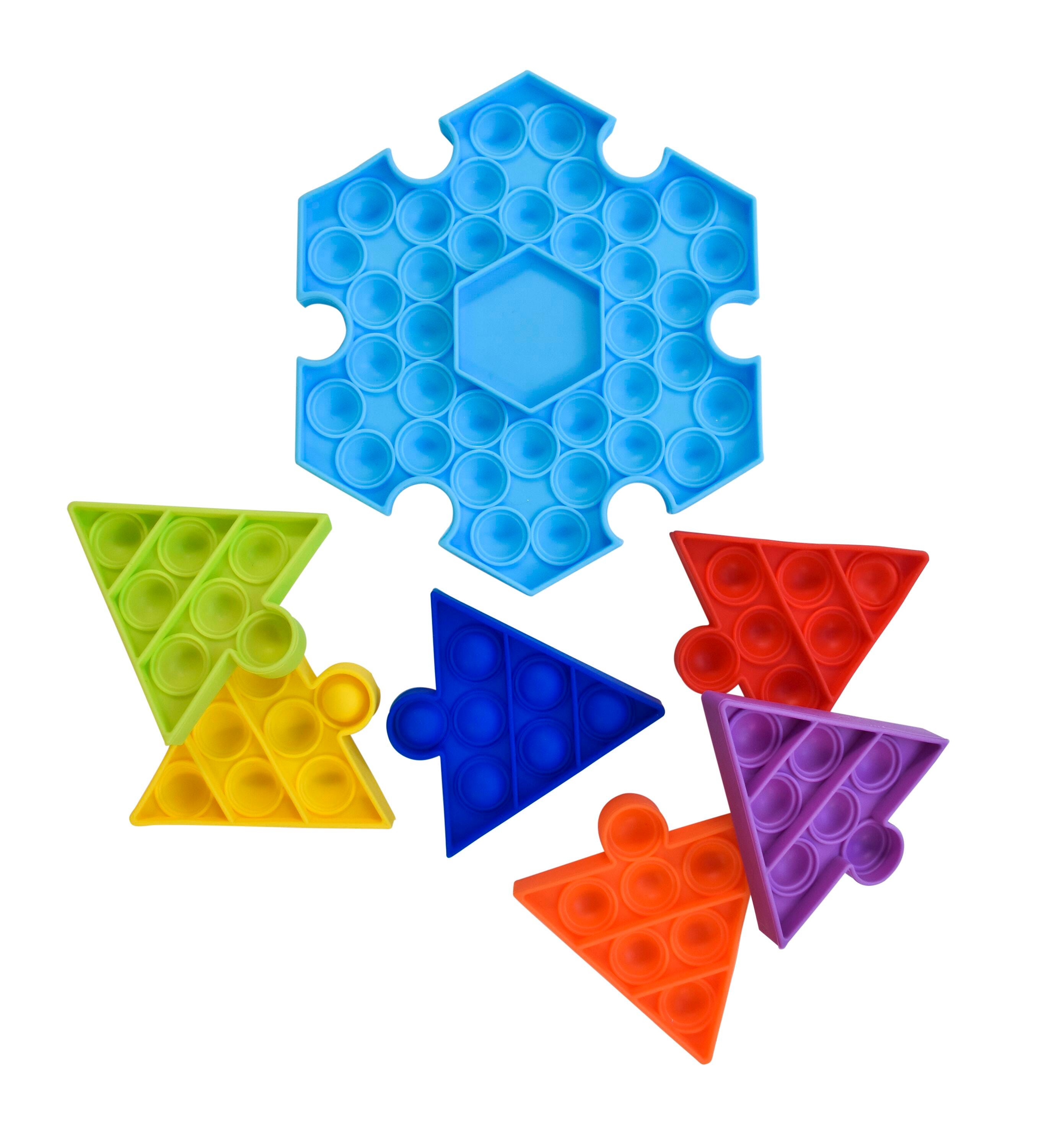 The perfect combination of satisfying push pops and puzzle-solving in one item. The Push Pop Puzzle features a large 6-3/4" x 6" center piece and six 3-1/4" triangles in assorted colors. Made of soft silicone texture for just the right touch input for the fingers with a soothing sound for the ear as you pop it.