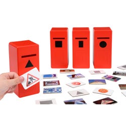 Educational Advantage Shape Posting Game is fun and educational! Sort pictures by their shape with these self-checking, real photo cards. Develops shape identification, sorting and fine motor skills. Features four brightly colored plastic boxes, each with a shape on the front (square, triangle, circle and rectangle), measuring 5-1/2 in x 2-3/10 in x 2-3/10 in. Includes 40 double-sided cards with colorful photos and a picture of the shape pictured on the reserve side. Cards measure 2 in x 1-3/10 in. Ages 3 and Above.Features