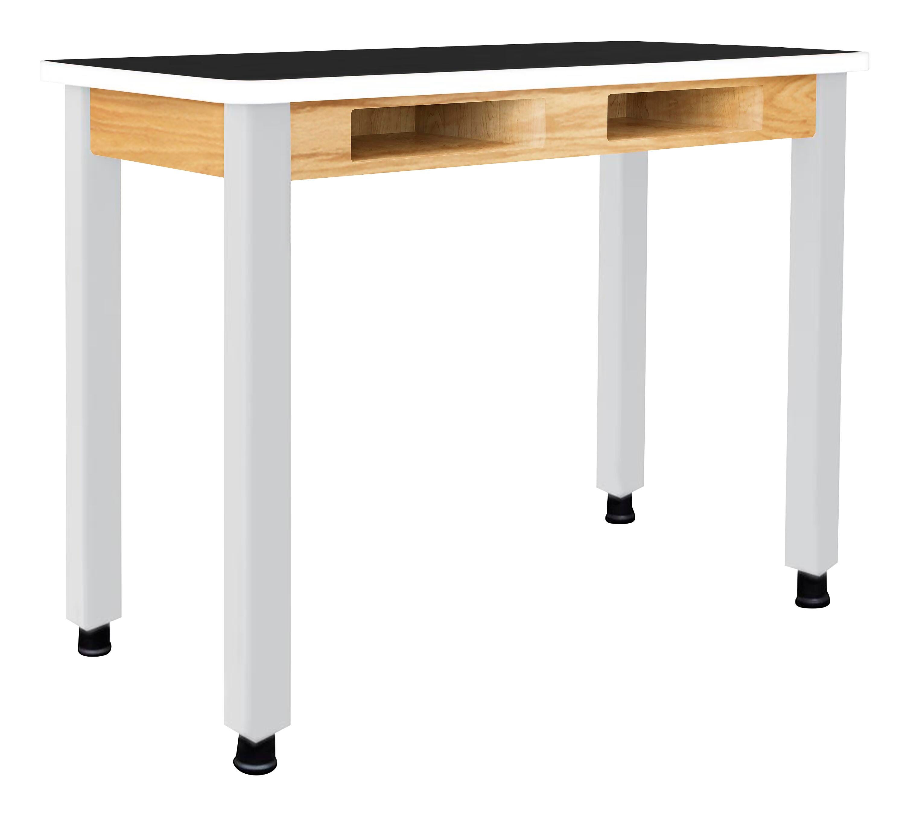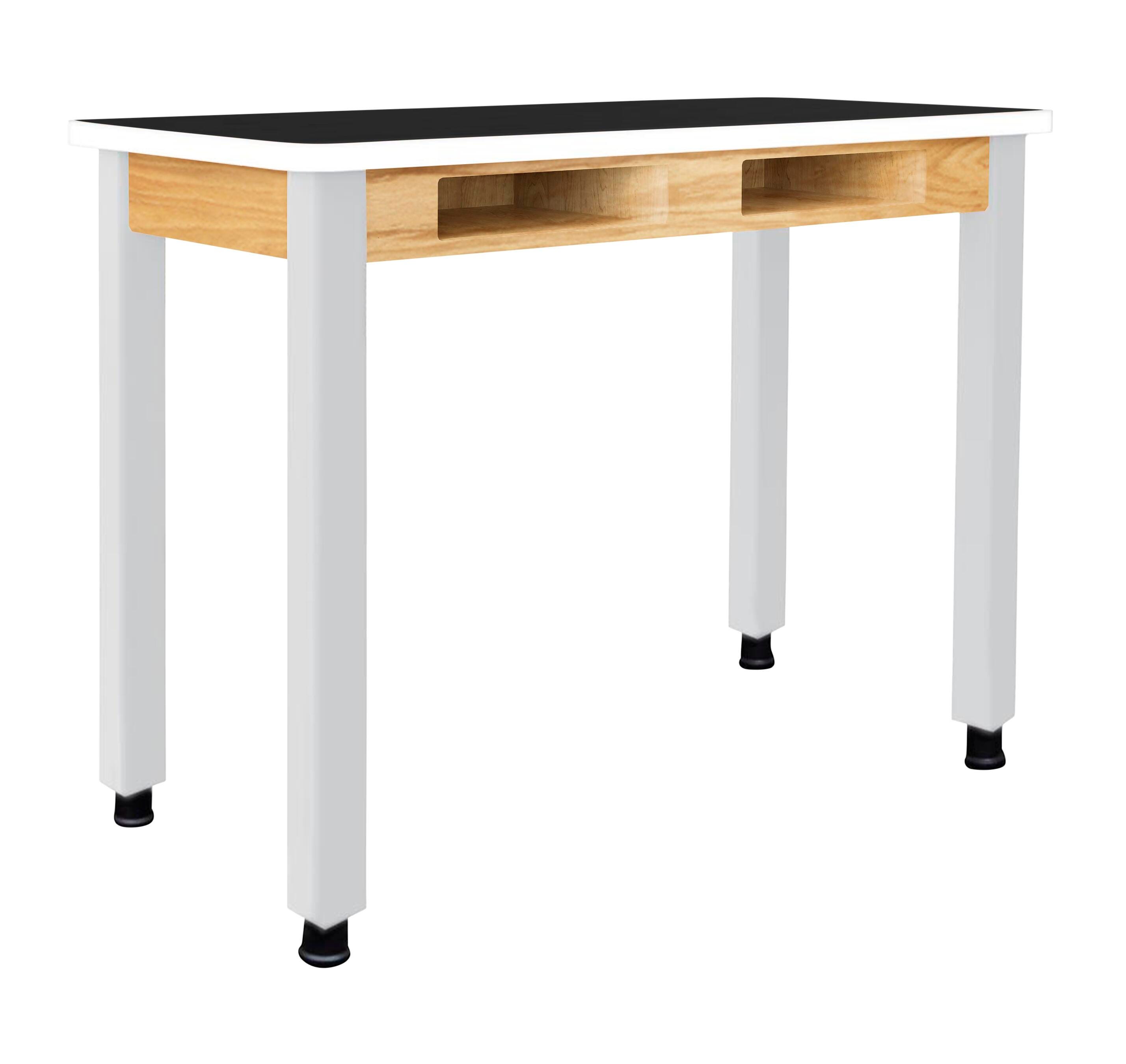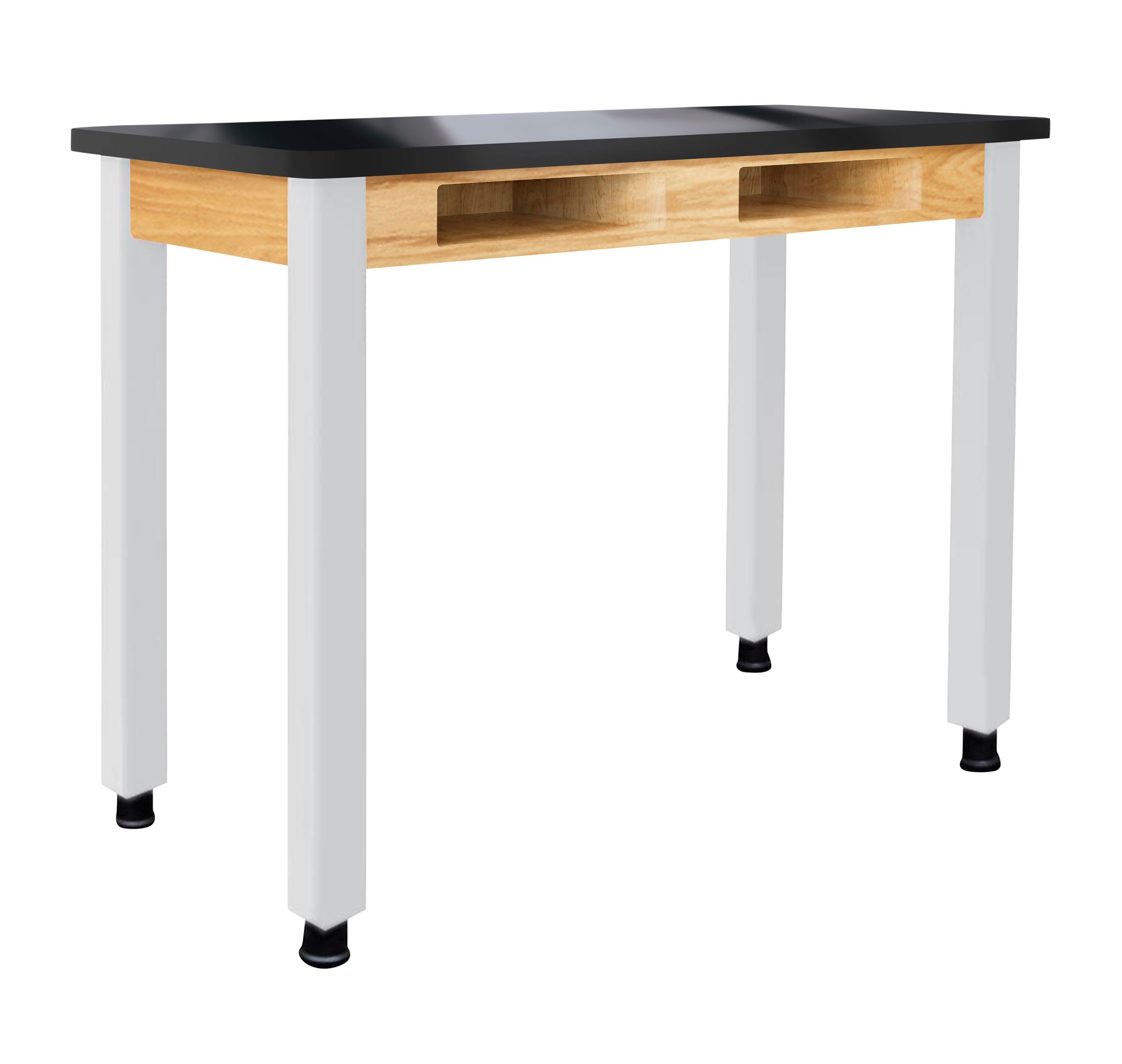 Classroom Select Science Table with book compartments has apron and legs constructed of smoothly machined solid red oak and finished with a chemical-resistant, earth-friendly UV finish. The apron is 13/16 x 4-1/2 inches with heavy-duty 13 gauge steel corner braces. The 2-1/2 inch square steel tube legs have 5/16 inch hanger bolts installed and attach to the apron with supplied nuts and washers. The table is equipped with non-skid adjustable glides for the prevention of rocking on uneven floors.