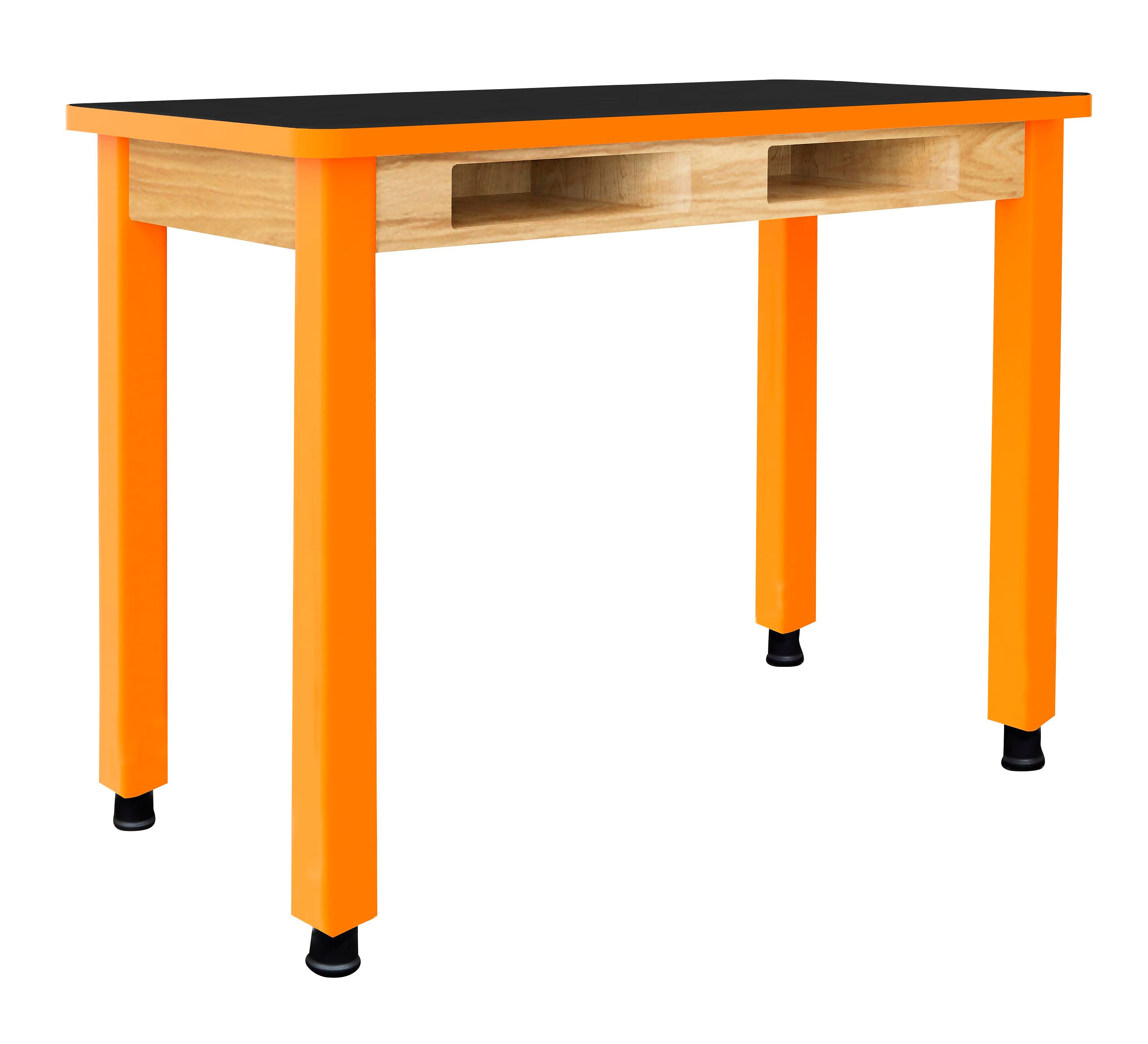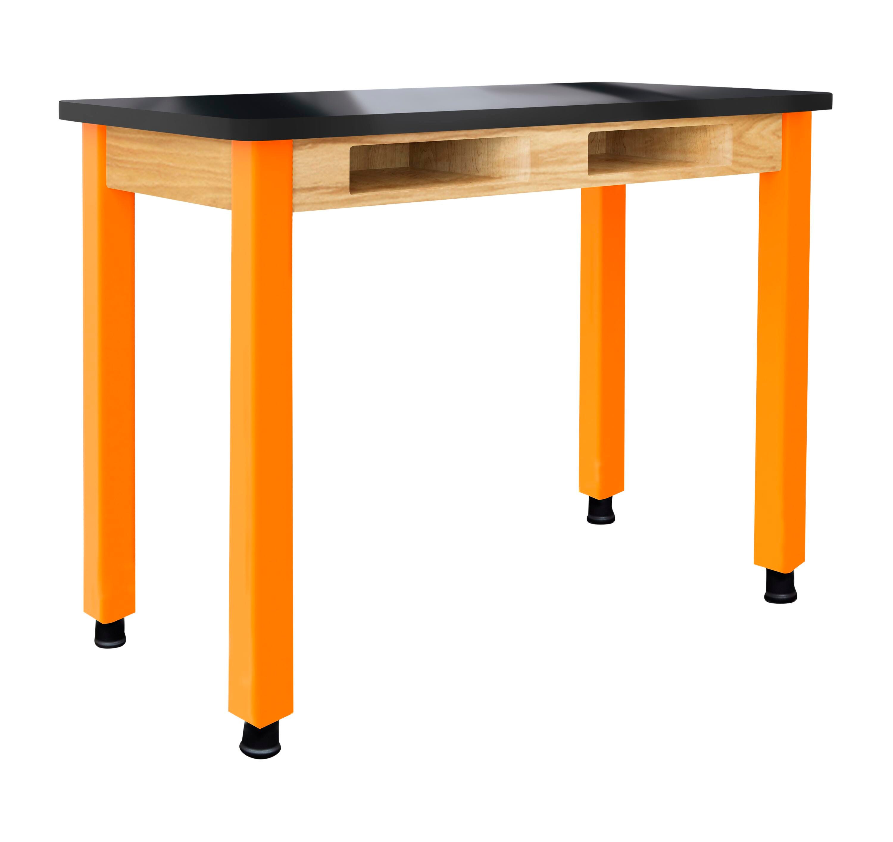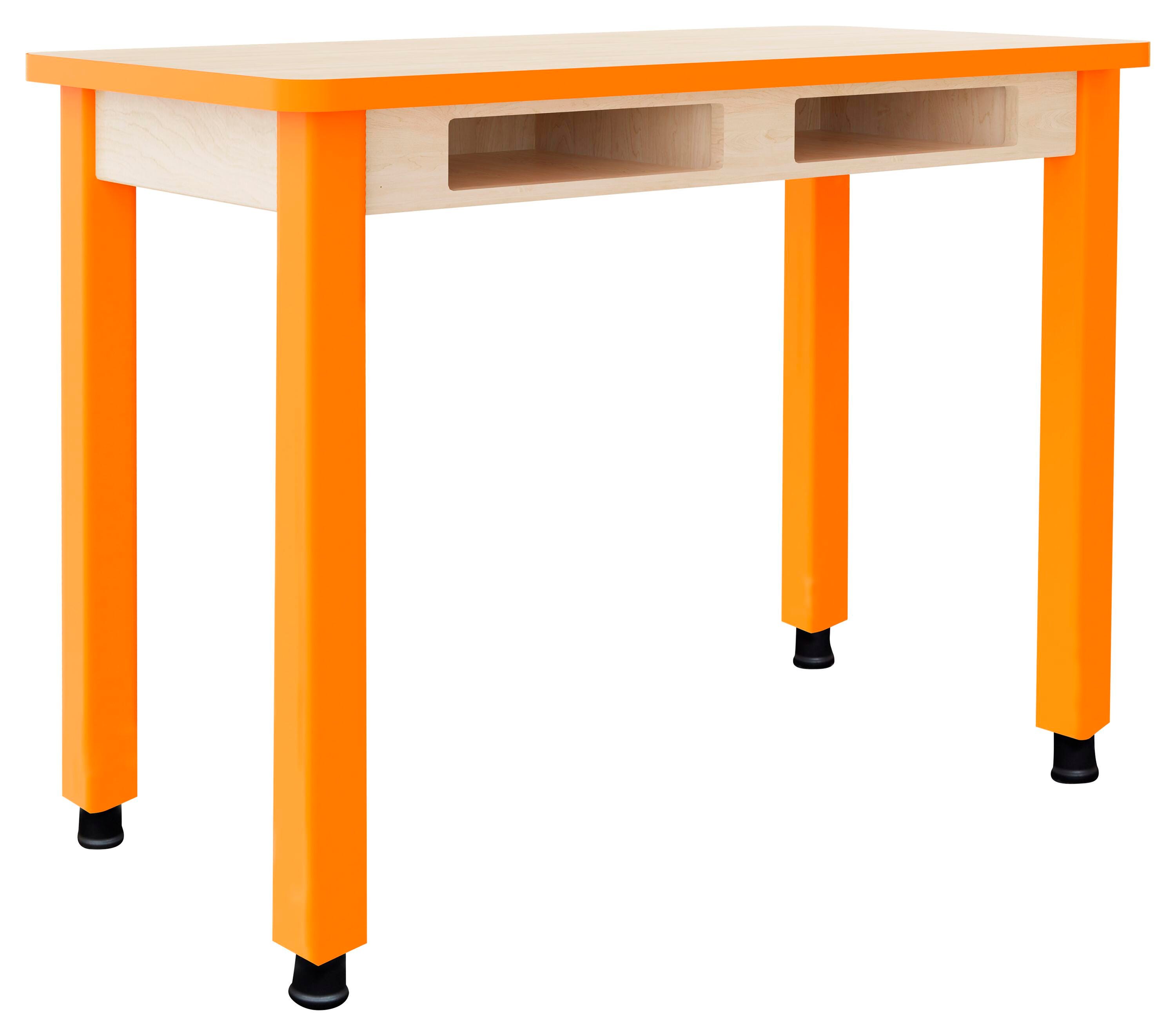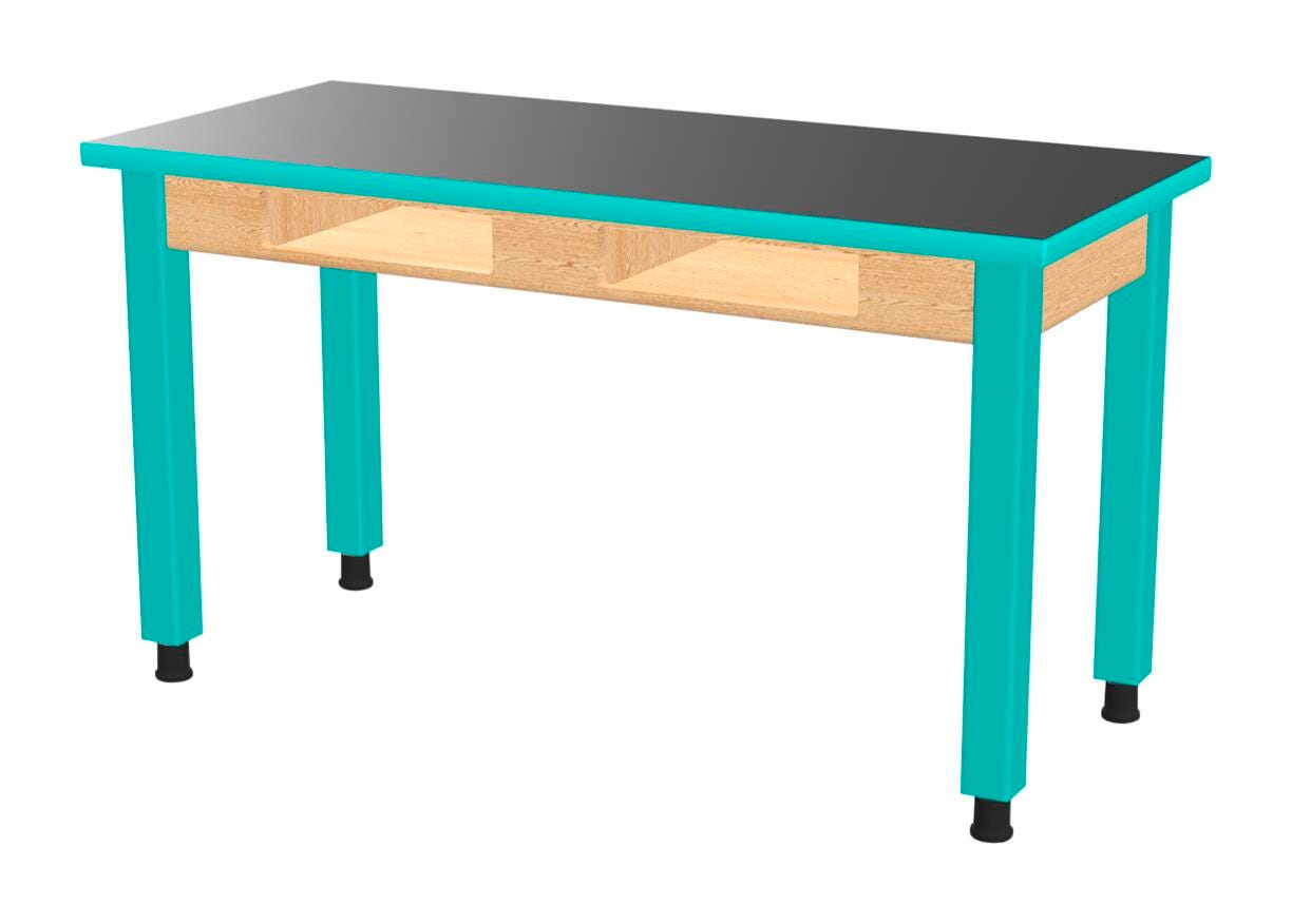Classroom Select Science Table with book compartments has apron and legs constructed of smoothly machined solid red oak and finished with a chemical-resistant, earth-friendly UV finish. The apron is 13/16 x 4-1/2 inches with heavy-duty 13 gauge steel corner braces. The 2-1/2 inch square steel tube legs have 5/16 inch hanger bolts installed and attach to the apron with supplied nuts and washers. The table is equipped with non-skid adjustable glides for the prevention of rocking on uneven floors.