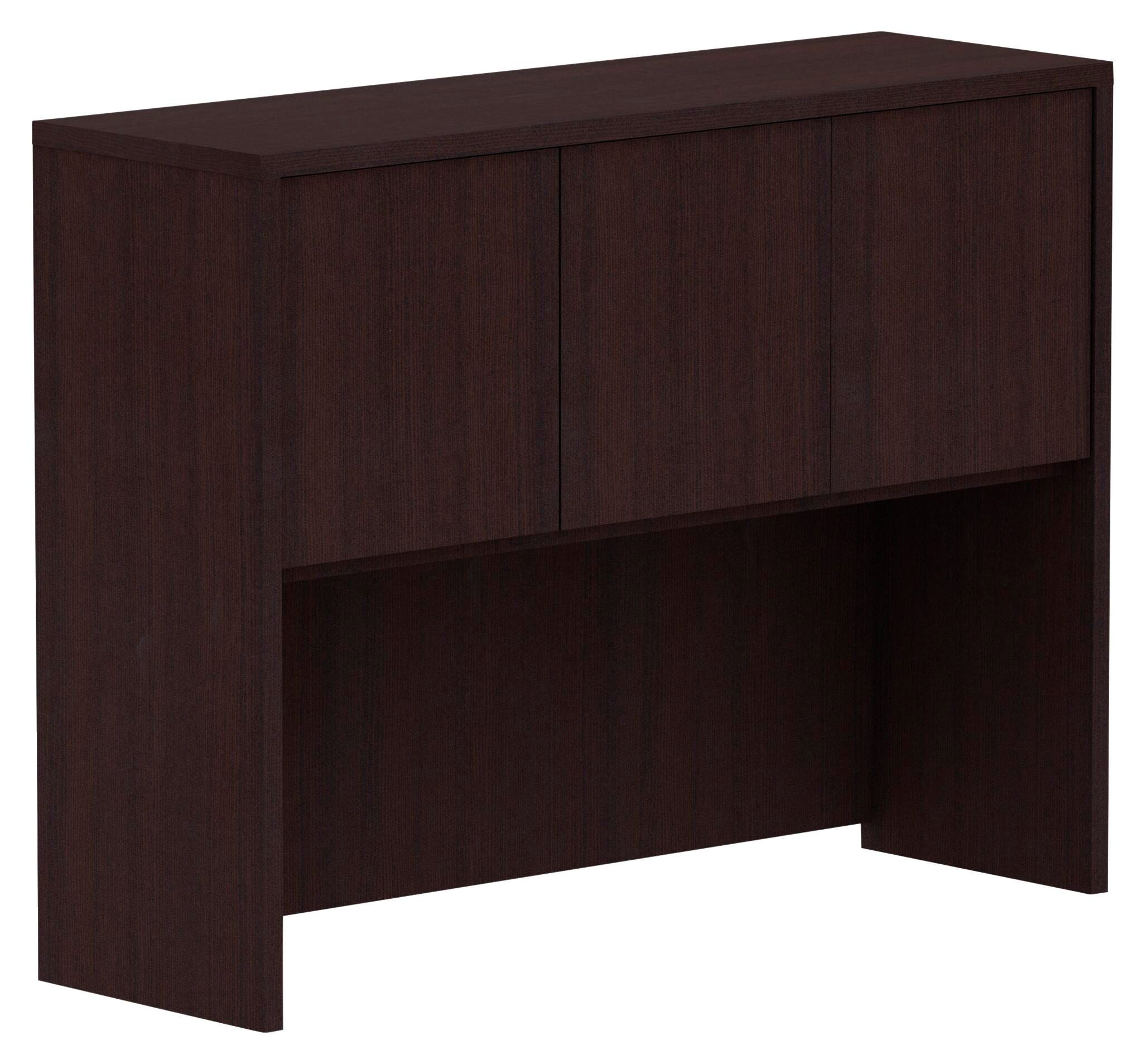 This hutch with doors offers a high-quality, espresso laminate construction with metal-to-metal, cam-lock connections. The design includes 3-millimeter PVC edges and adjustable floor guides for stabilization. This unit has predrilled holes with metal inserts for easy attachment by screws of pedestals. The brackets are designed for L-shaped configurations and bridge returns. Unit has a durable 1 inch thick laminate top.