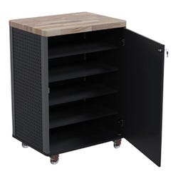 The Classroom Select Makerspace Double Cart offers a larger capacity than the single cart. Sized at 32-1/2 x 25-1/2 x 40 inches in case larger trays or projects are needed for storage. Cabinet tops consist of 1-7/8 inch finished solid wood butcher block. Interior adjustable shelves are constructed of a 5/8 inch melamine core with black laminate paper on top and bottom of the surface for balanced construction. The entire back panel is a magnetic markerboard, made of durable 28 gauge painted steel. On the backside of this makerspace unit, there is a large Titanium color polypropylene handle for easy push or pull movement. Each side is constructed of a steel peg board perfect for hanging needed supplies and tools during project learning and collaboration. Smooth mobility and secure positioning with two casters that are locking and two non-locking casters.Features