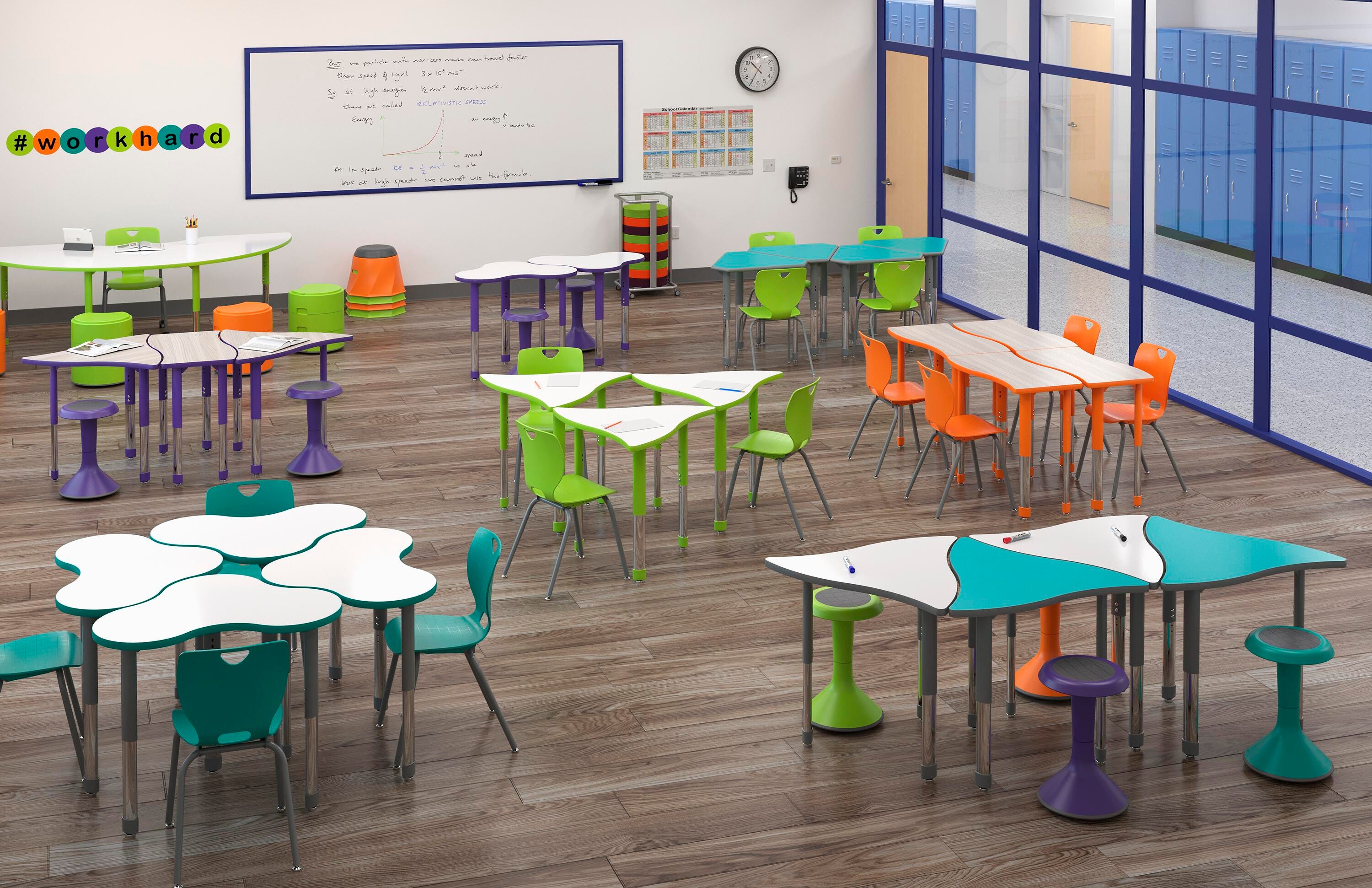 These shaped desks have a laminate or markerboard top and are perfect for collaborative interaction, encouraging student creativity and learning. These unique desks are ideal for individual or group activities and can be arranged in various configurations. Not only will these desks promote collaboration but will be visually apealling in any classroom or workspace.