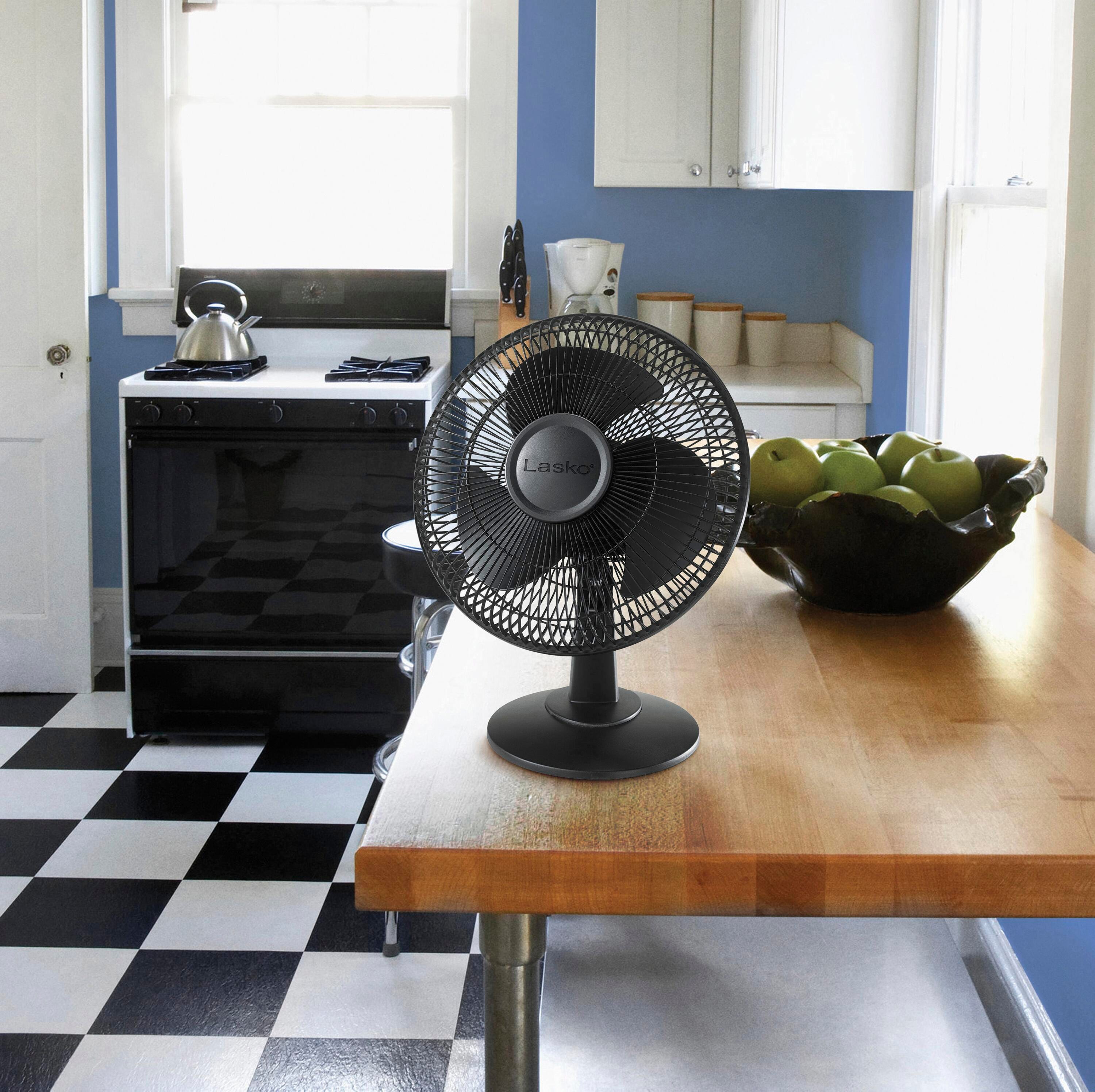 The Lasko 12-inch table fan is perfect when extra space is at a premium. With wide-area oscillation, adjustable tilt-back and a compact head, this stylish, 3-speed fan covers a wide area in a minimum of space. When the weather heats up, you can count on this fan to create a soothing, summer breeze in any room.