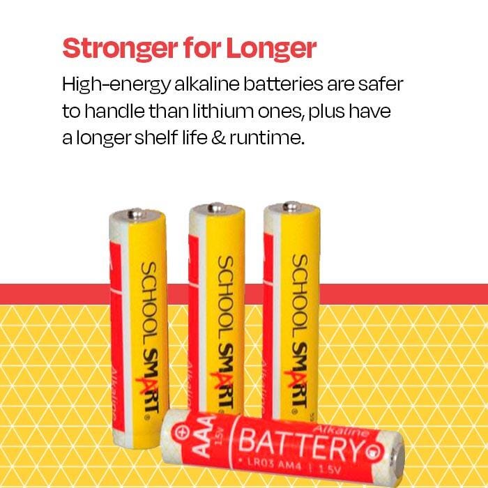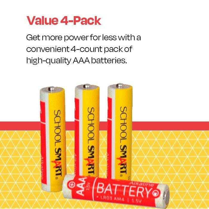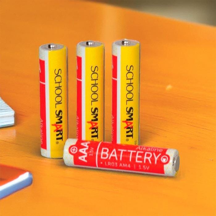 School Smart Alkaline Battery of AAA is built to last for extended use and is priced with the teachers in mind. This long-lasting, high-quality alkaline battery is ideal for everyday use. Provides reliable power for electronics, remote controls, toys, games, flashlights, and battery-operated office equipment. Sold in a pack of 4 batteries.