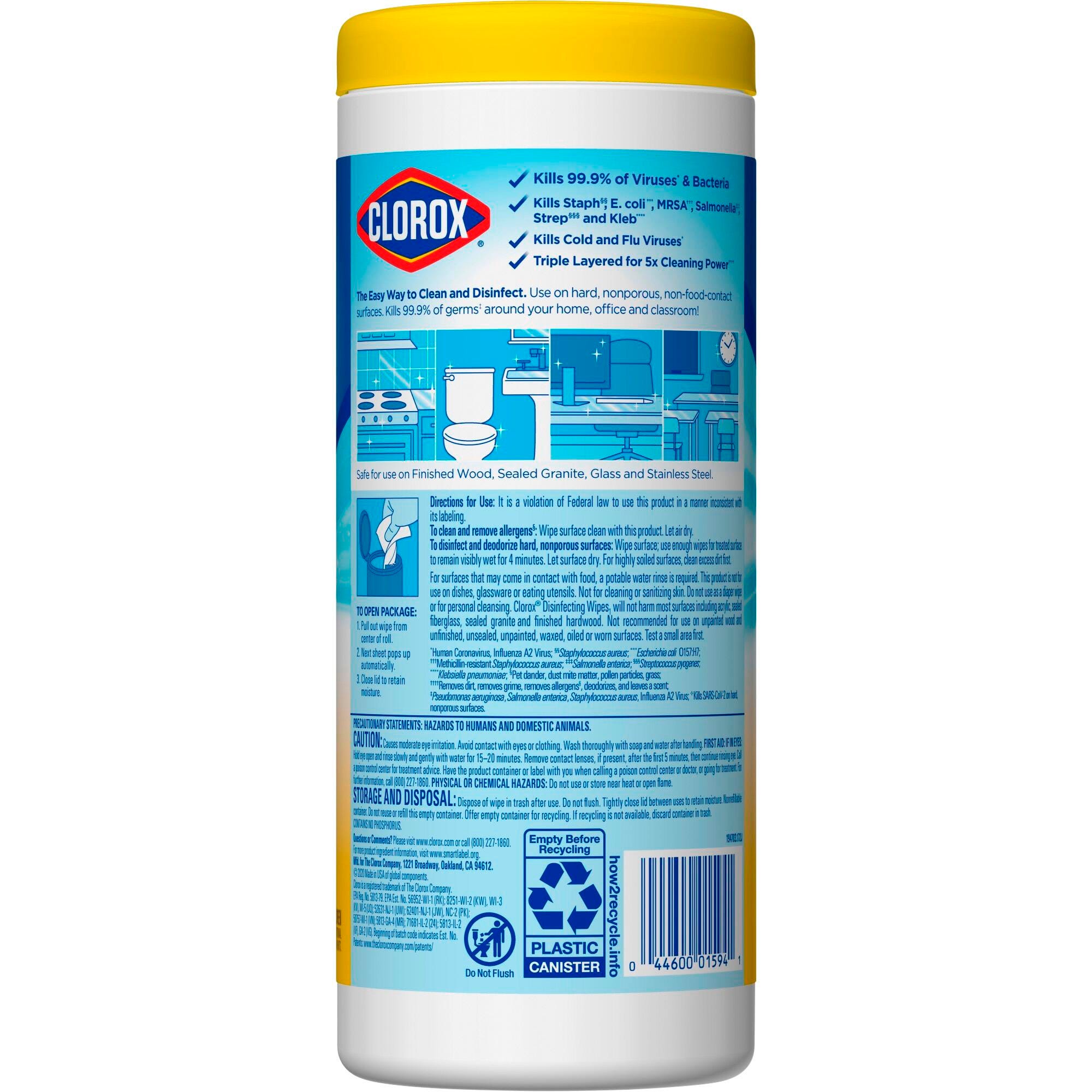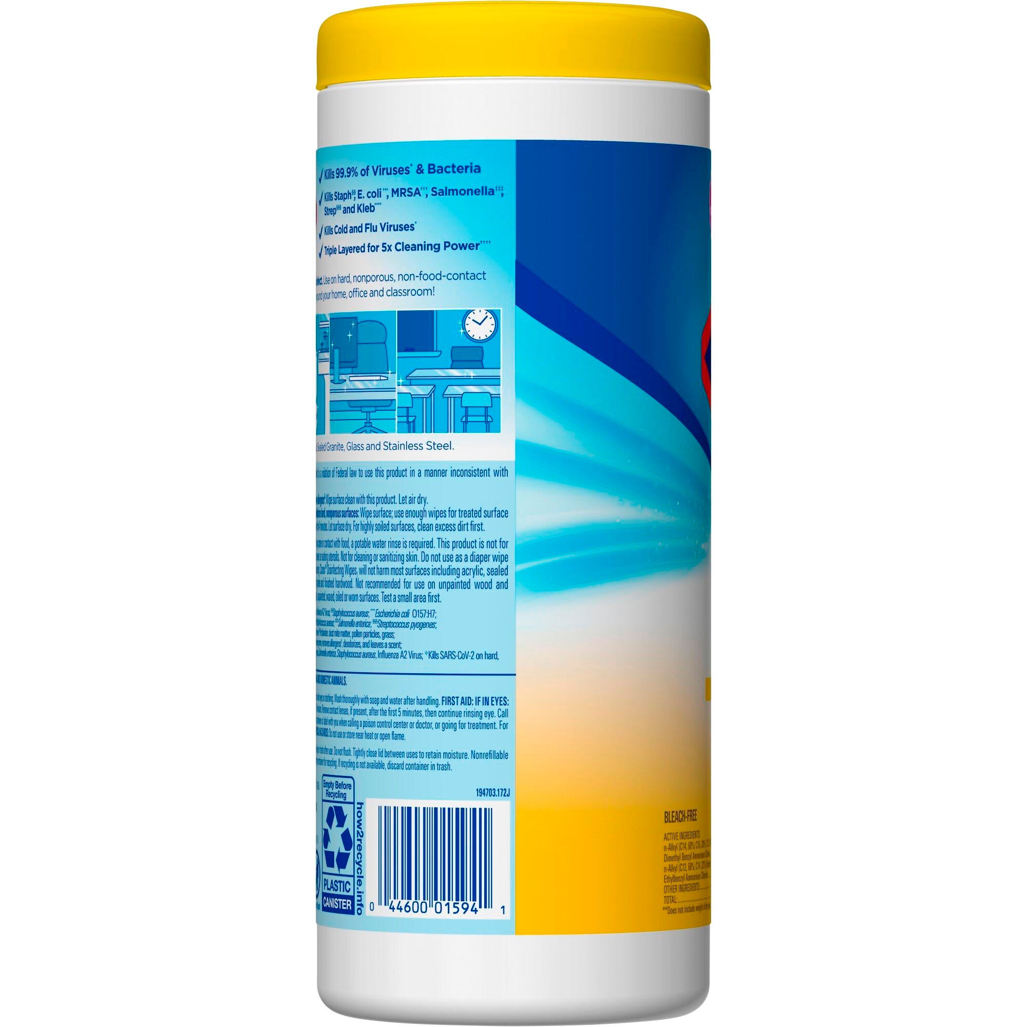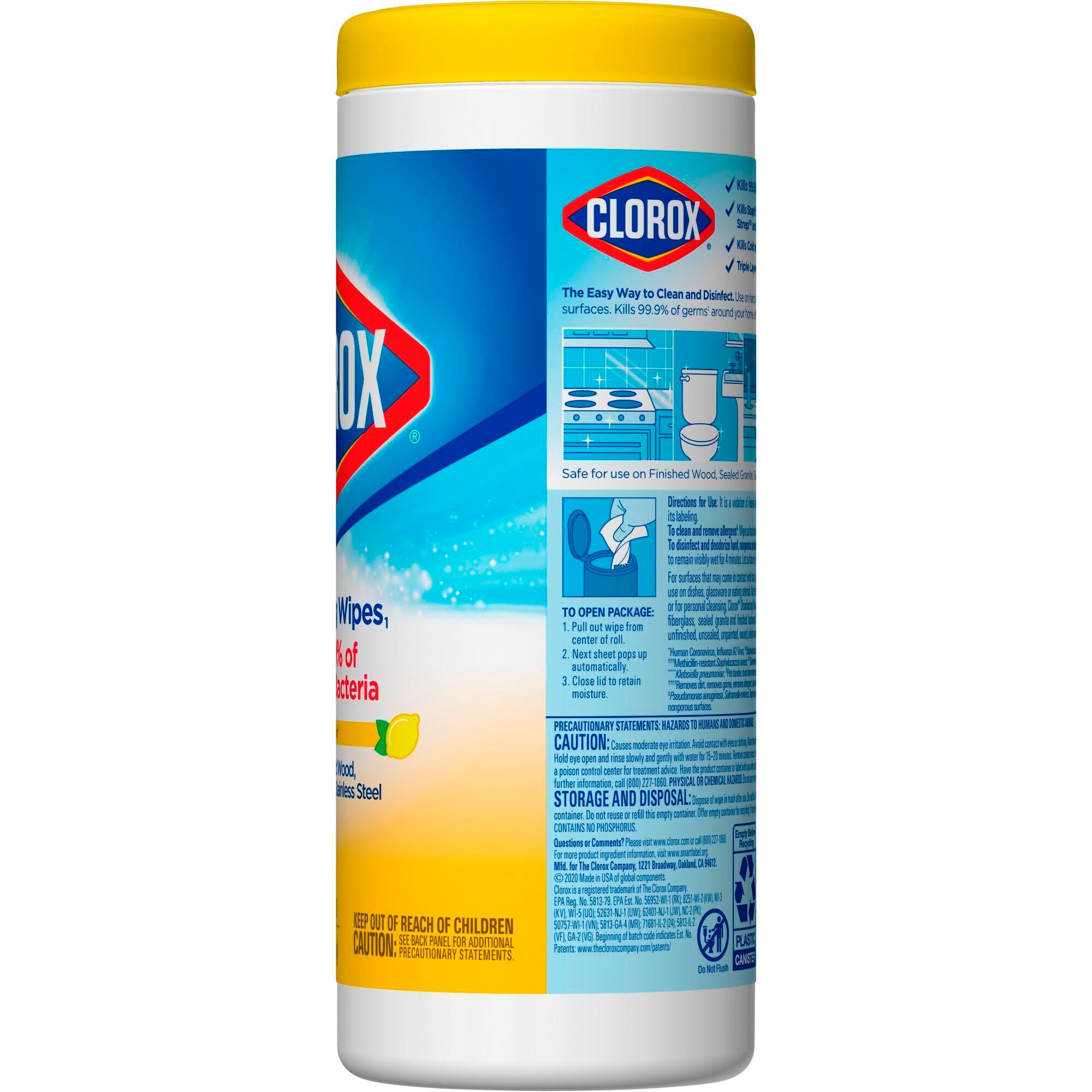 Clorox Lemon Scented Disinfecting Wipe Canister contains 35 wipes featuring bleach-free formula that kills 99.9% of bacteria including staph and salmonella. It is a one-step cleaning and disinfecting solution that is perfect for day care centers, offices, schools and restaurants. Quick, convenient pre-moistened individual wipe for cleaning hard surfaces comes in air-tight canister package that keeps it moist and effective. It is sold as 12 per case.Features