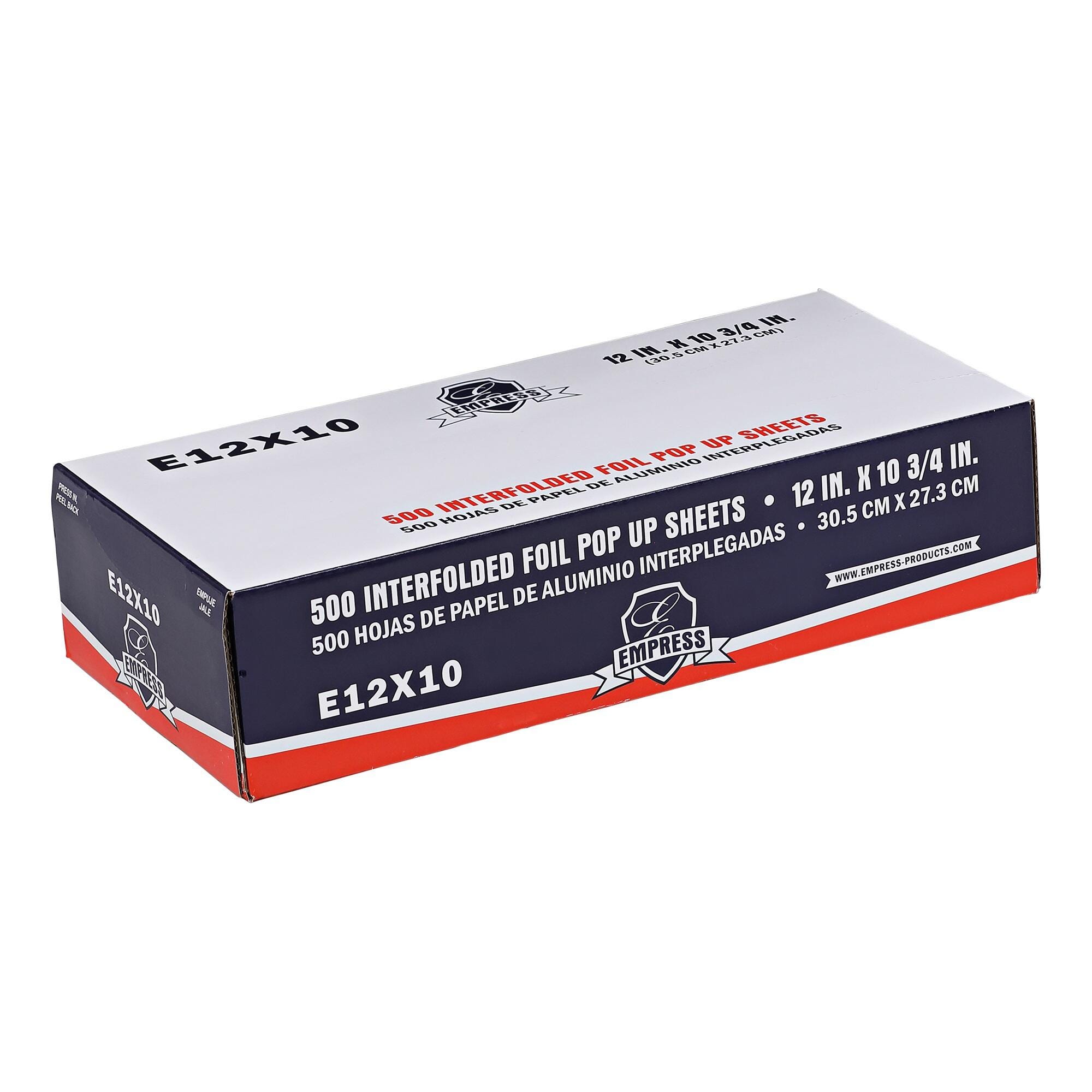 The Empress Pop-Up Aluminum Foil is an affordable and versatile solution for food prep and service. These pop-up sheets offer interfolded, individual sheets of aluminum foil for versatile and effortless use. Empress Foil is fully recyclable and certified Kosher. Each sheet of foil measures 12 x 10-3/4 inches. This case delivers 6 boxes, each containing 500 sheets of foil.Features