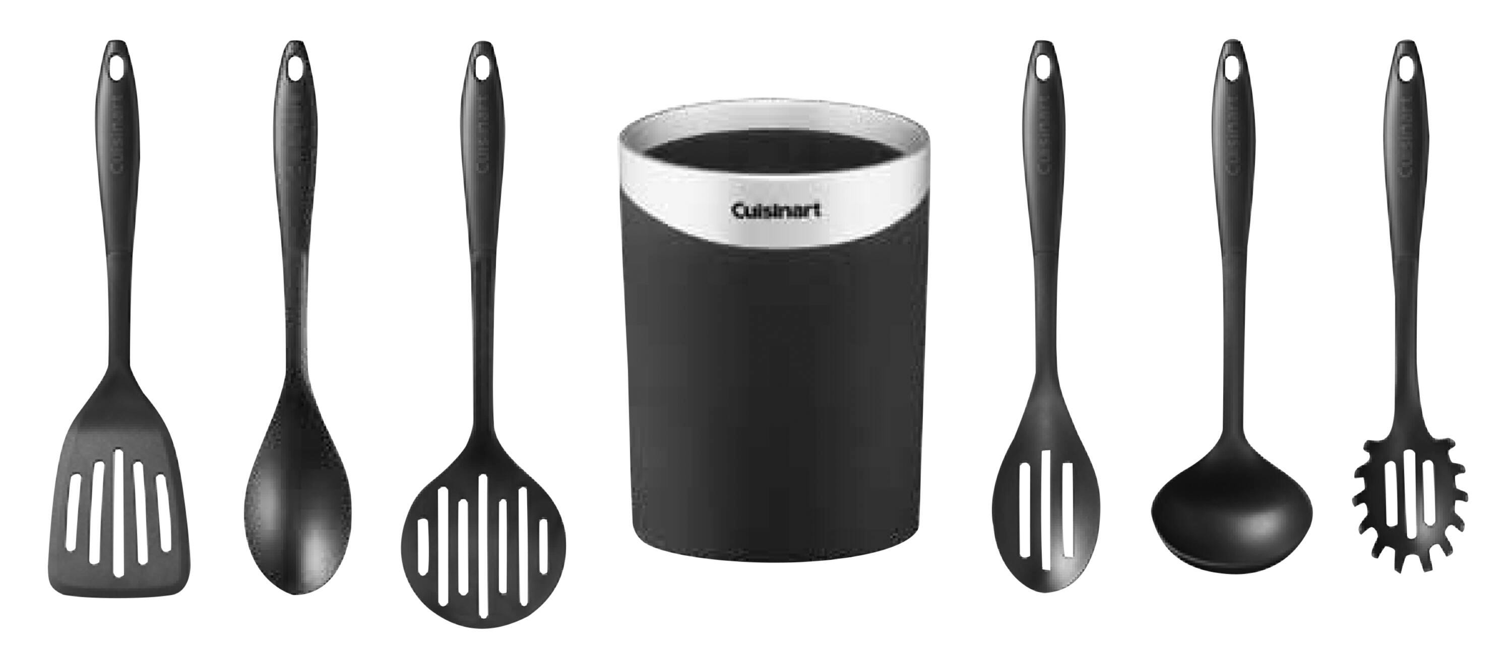 The Cuisinart CTG-00-CCR7 crock with curve handle kitchen tools is a must-have in every well-equipped kitchen. Kitchen tools include slotted turner, solid spoon, skimmer, slotted spoon, ladle and pasta server. The crock keeps everything gathered together in one location within easy reach. The tools are designed to lie flat on the countertop and will not roll. Nylon tool heads are safe for nonstick cookware and are heat resistant up to 400 degrees F. Kitchen tools have soft-grip ergonomic handles and are dishwasher safe.Features