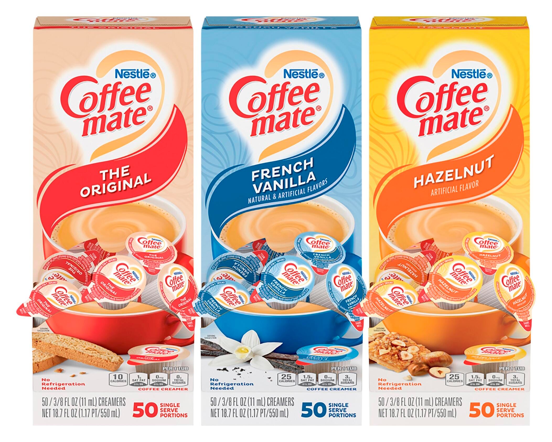 Delight your employees, customers and guests by offering Coffee mate liquid creamer in your workplace, breakroom or kitchen. Variety pack includes three flavors, including Original, French and Hazelnut. French vanilla liquid creamer offers a deliciously creamy, classic vanilla taste that's perfect anytime. Hazelnut flavor coffee creamer is the perfect way to create a delicious cup of nutty sweetness. Rich, smooth flavor makes it perfect for the breakroom or reception so everyone can enjoy coffeehouse indulgence without ever leaving your office building. The nondairy creamer is lactose-free, gluten-free and Kosher Dairy. The single-serve tubs do not require refrigeration.