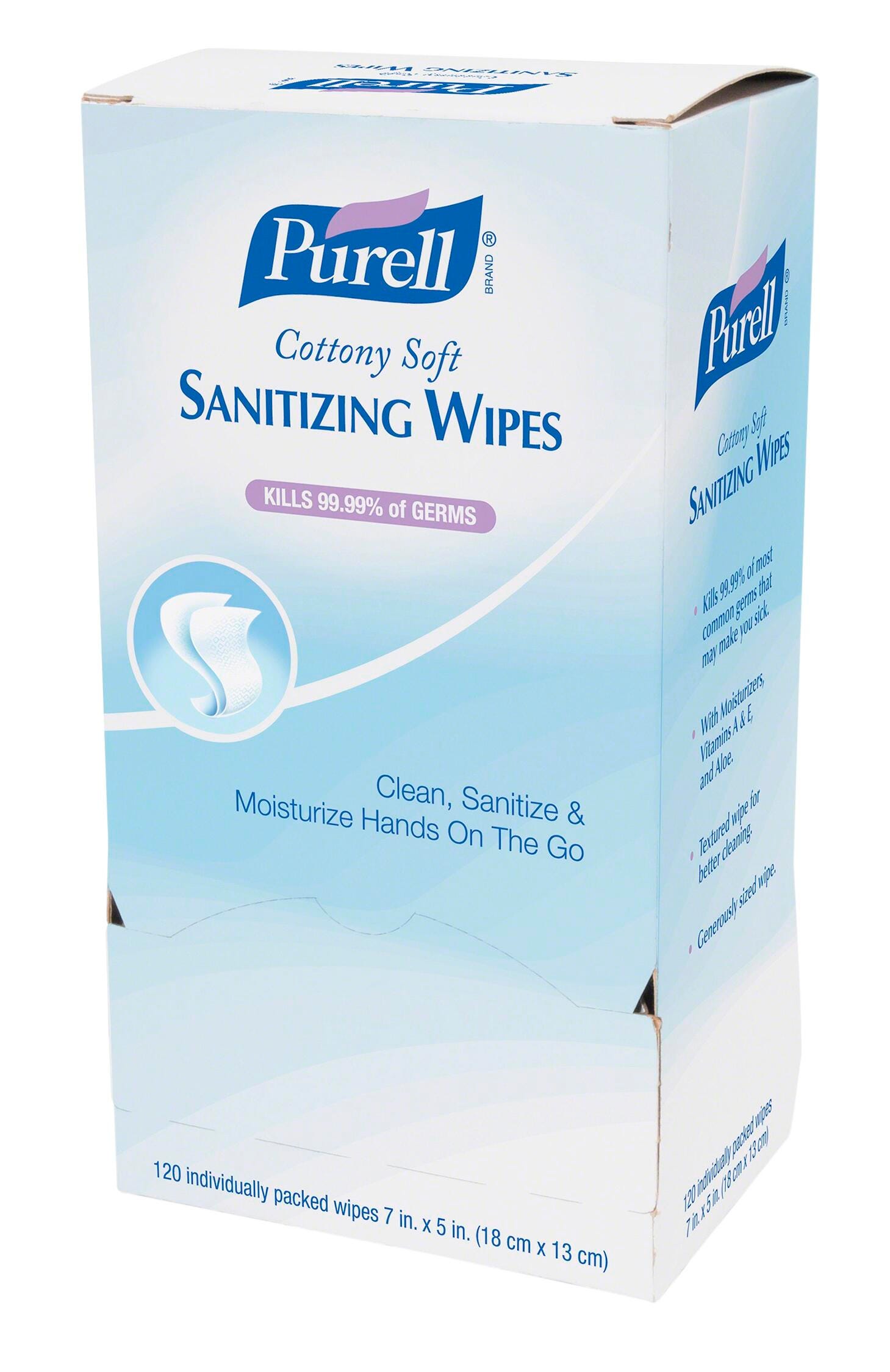 Clean, sanitize and moisturize hands on-the-go with Purell Cottony Soft Sanitizing Wipes. Thick wipes are textured for better cleaning. 62 percent ethyl alcohol formula kills 99.99 percent of most common germs that may make you sick. Moisturizers, Vitamins A and E and aloe help maintain healthy skin. Individually wrapped wipes are convenient and easy to use in offices, restaurants, healthcare facilities or anywhere else germs might be.
