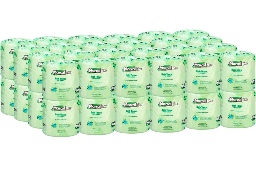 Marcal Pro 2-Ply Bath Tissue provides an environmentally responsible way to keep your bathroom stocked. Virtually lint-free design is gentle on skin, strong and absorbent. Septic-safe rolls are individually wrapped for sanitary use. Eco-friendly design is made with a high percentage of recycled material to reduce our global impact. This item is Eco Friendly. White.