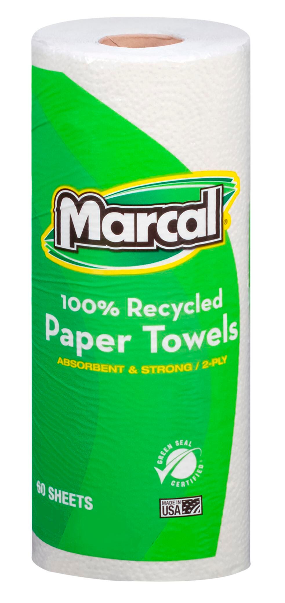 Marcal Premium 2-Ply Recycled Paper Towel Roll is absorbent and virtually lint free. Strong towel is made from 100% recycled content and 60% post-consumer materials. Roll contains 60 sheets and is sold as 15 per pack. This item is Eco Friendly. Each sheet measures 11 x 9 inches.