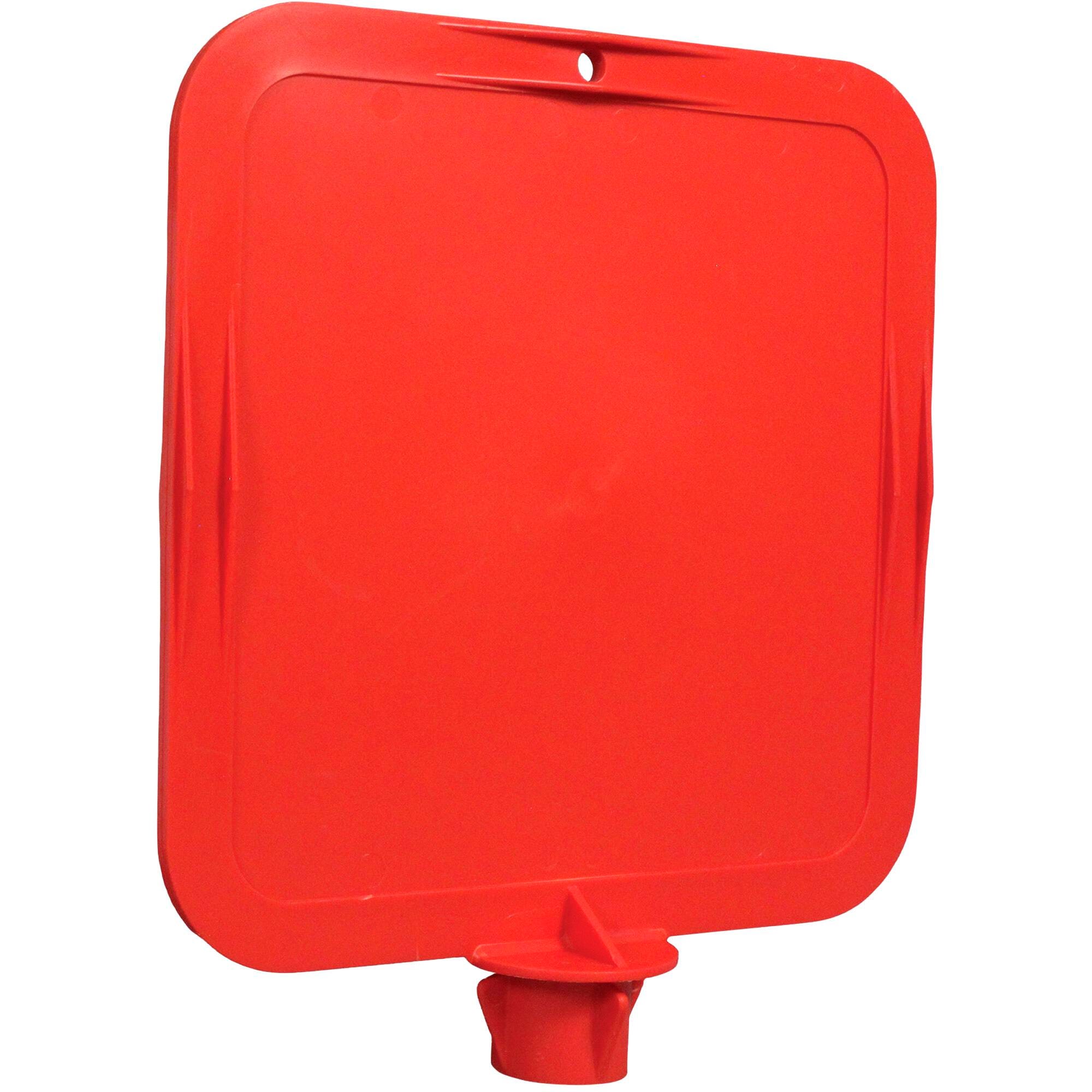 Lock-in sign features a bright-red design to ensure your message stands out when mounted atop a four-sided floor sign. 8" square space provides plenty of room to place message labels or signage. Sign is designed for 25" and 36" four-sided cones (sold separately).