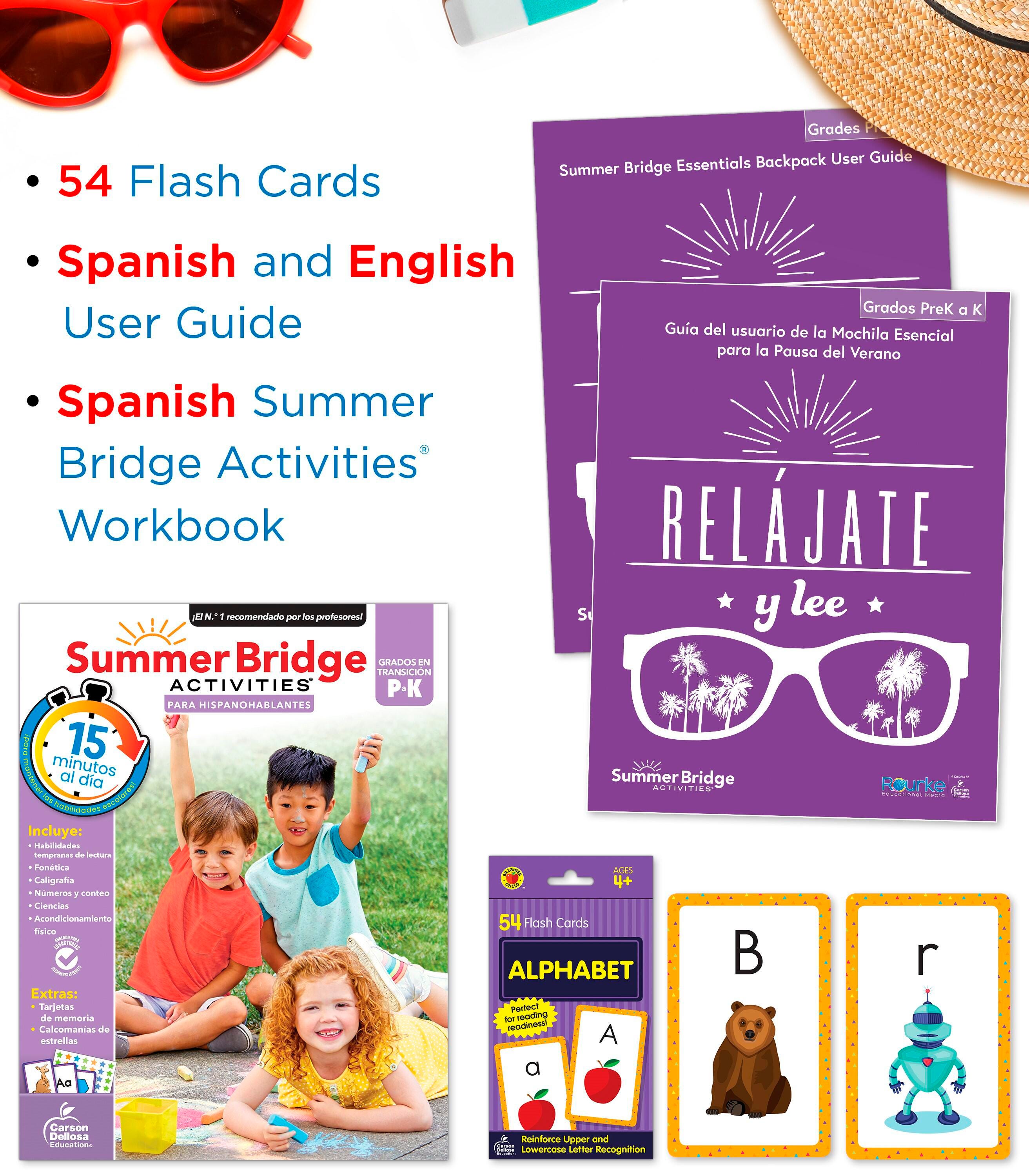 Help prevent summer learning loss and prepare your bilingual or Spanish-speaking child for back-to-school success with engaging activities, exercises, fun games, and more that help students learn basic English―all in one summer learning bundle! This Spanish Summer Bridge Activities bundle helps preschoolers keep their skills sharp during the summer months to stop summer slide and prepare for kindergarten. The preschool learning resource bundle includes a Summer Bridge Activities prek-k Spanish Workbook for kids with stickers, and Spanish instructions and lessons to help Spanish-speakers to work alongside their child to complete activities in just 15 minutes a day with over 60 days of summer learning activities! The bundle also includes 4 high-interest children's books, a box of alphabet flash cards, and Spanish and English user guides to help increase family engagement. With the summer reading books, toddler flash cards, User Guides, and an award-winning Summer Bridge Activities preschool workbook, Spanish-speaking students practice their English and Spanish language skills while learning primary phonics, alphabet letters and number recognition, taking on fitness activities, science experiments, practicing tracing and handwriting, going on an epic reading journey, and more to keep the learning going all summer long!