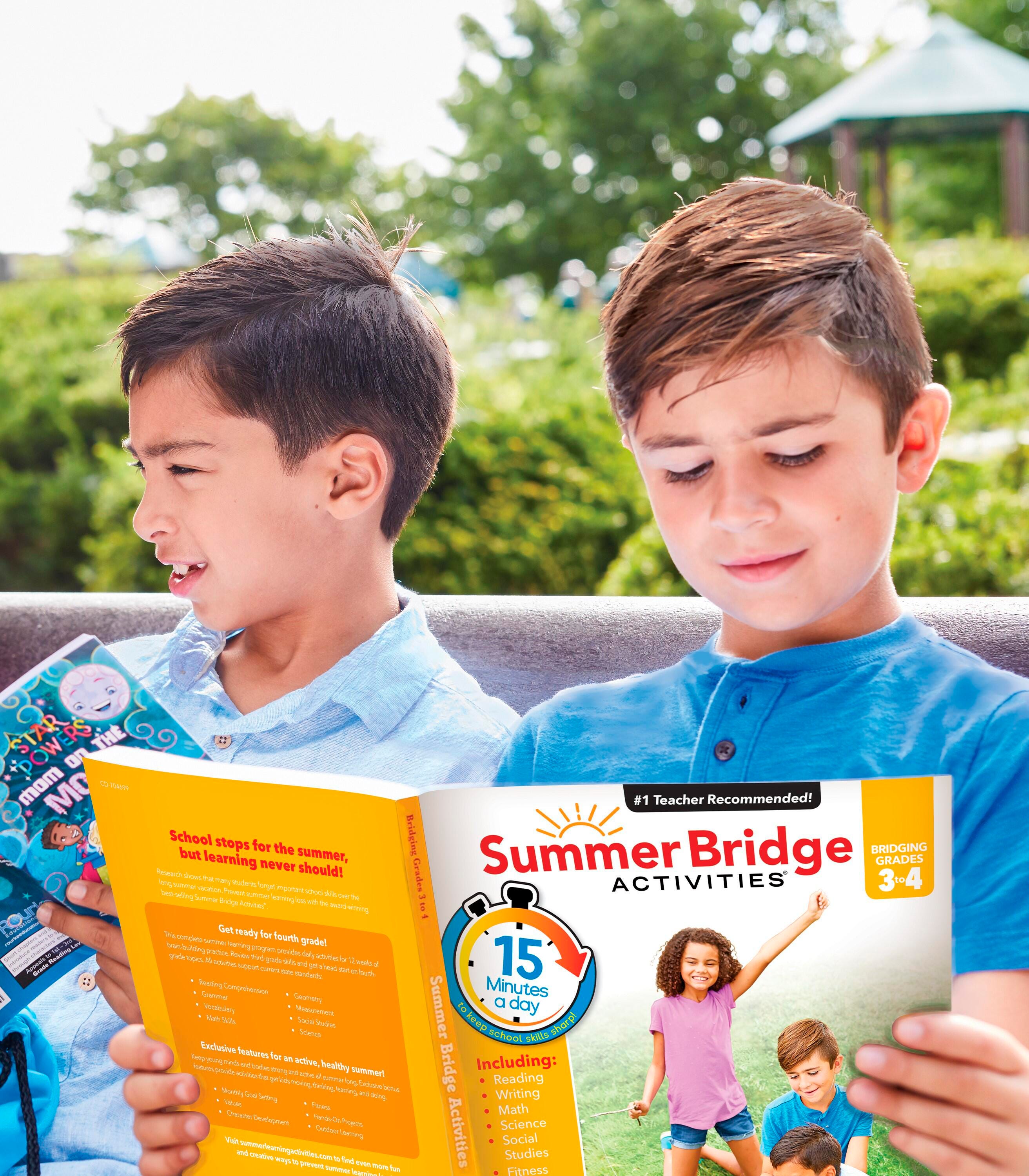 Summer Bridge Activities workbooks feature phonics, math, science, and handwriting activities, and includes flash cards, stickers, and fun fitness activities
