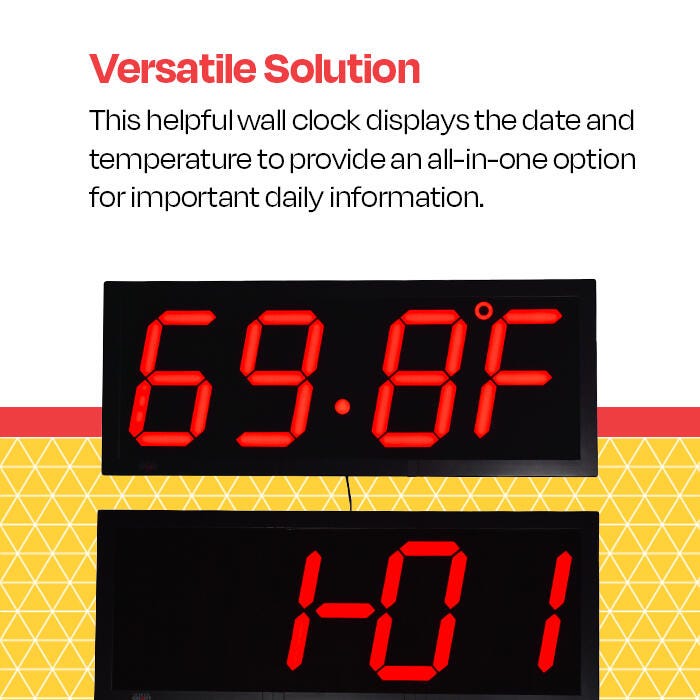 Master your time with the modern ease of the Large LED Wall Clock from School Smart! This visible clock includes 8-inch high red digits, a calendar (dd/MM or MM/dd selectable), and temperature (Celsius or Fahrenheit) displays, and a remote control that adjusts time for your convenience. It works with an AC power adapter and a battery backup that requires CR2032 batteries (sold separately). Please make sure fresh batteries are used. This will prevent the clock time from being lost due to a power failure. The dual-buzzer alarm also includes an 8 to 9-minute snooze control. The full clock has a 12 or 24-hour format and measures 28 x 11-1/4 x 1-2/5 inches. Easy to mount on walls.