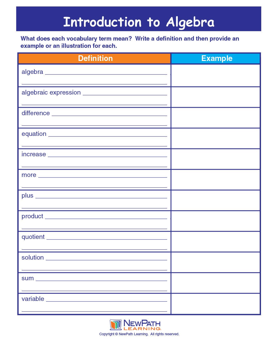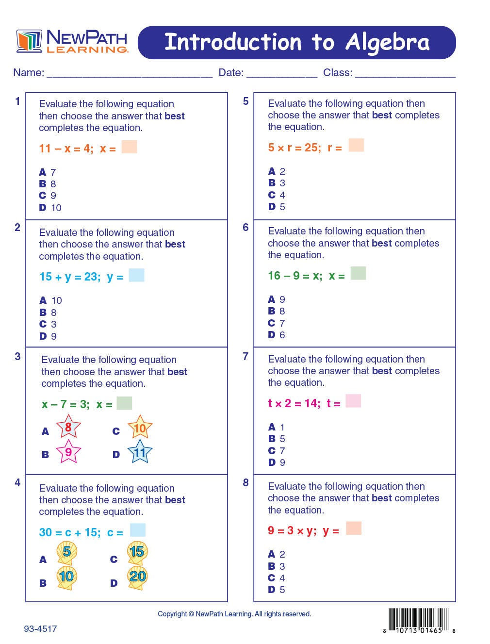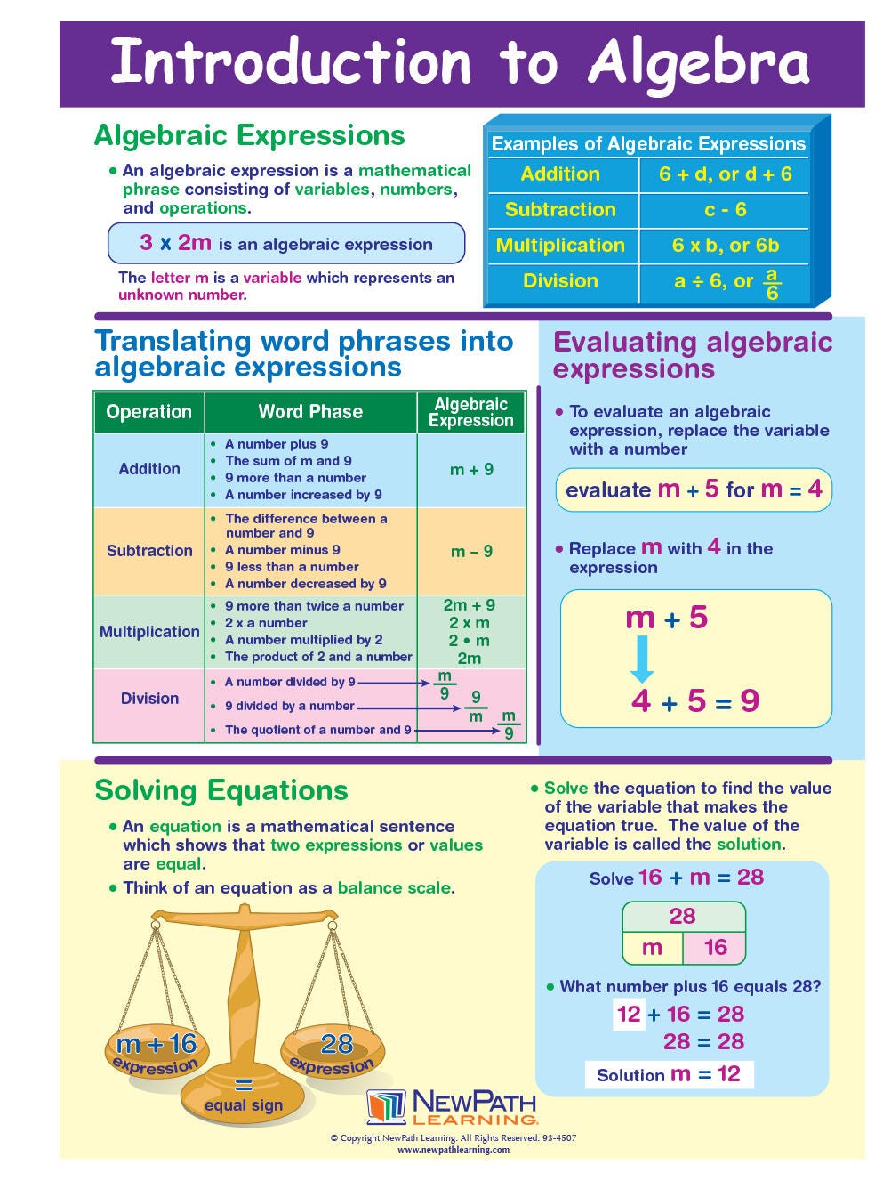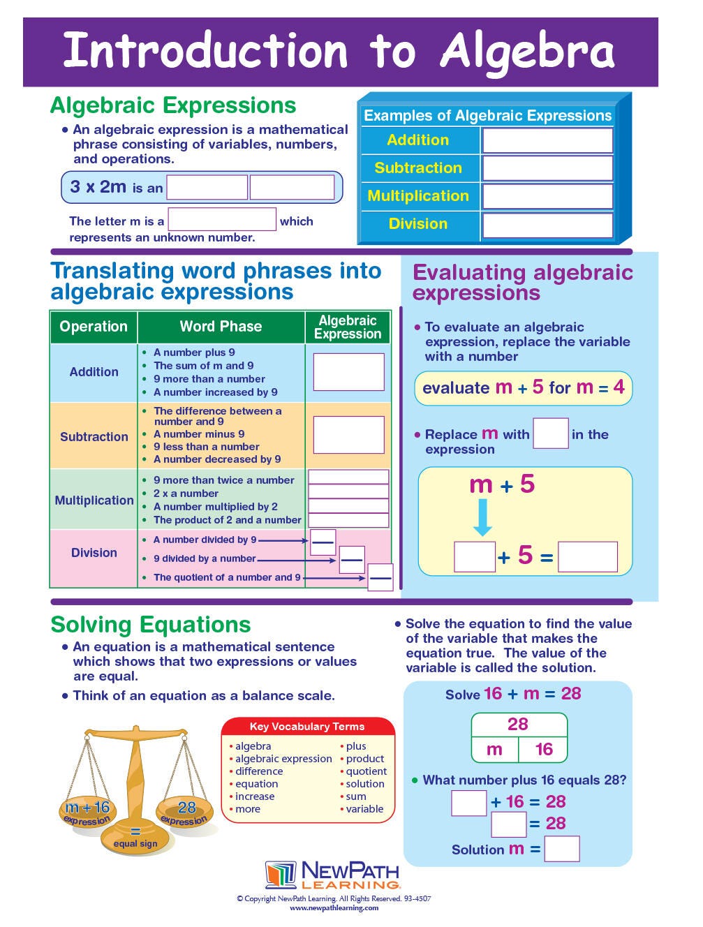 The perfect complement to any Math program, the set includes 10 laminated, “Write-on/Wipe-off” guides. Each 17 x 11 inch laminated guide covers a different topic and includes 4 panels featuring an illustrated overview of the concept; labeling & review exercises; a graphic organizer of the topic; and assessment/review questions. The set also includes a Teacher Guide with instructions for successful classroom integration and a 1-Year Premium Subscription to NewPath’s Online Learning Program providing access to online quizzes, games, activities, and more! Provides comprehensive coverage of the following topics: Introduction to Algebra; Properties of Addition & Multiplication; Introduction to Integers; Adding & Subtracting Integers; Multiplying & Dividing Integers; Solving Equations; Multistep Equations; Inequalities; Introduction to Functions; and Systems of Equations.