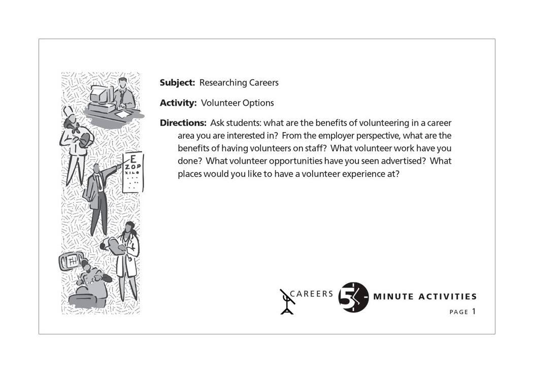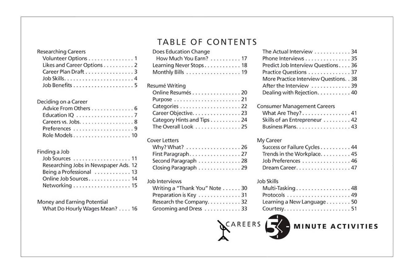 Use the 5 Minute Career Activities as quick, easy, and effective activities to fill extra minutes of class time. Each activity is calculated to last 5-10 minutes. The activities are a great way to introduce lessons, reinforce earlier learning, or used as conclusions to career education lessons. Each activity can be a creative and fun learning experience for students that allows them to get thinking about career options, resume writing, interview skills and more. Recommended for grades 6-12. 8 1/2"x 5 1/2" spiral bound book.
