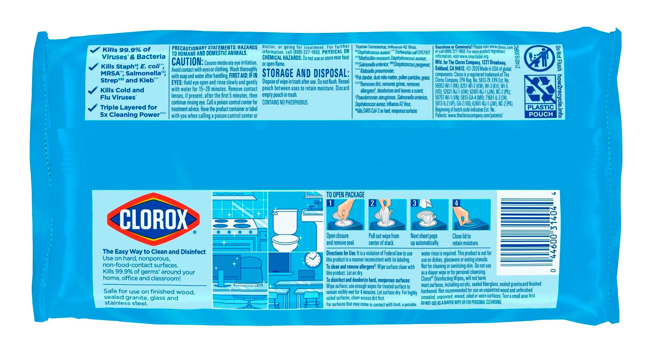 Disinfecting wipes feature an easy-to-pull design to provide the same bleach-free wipes you love in a space-saving pack that goes where you go. Each cleaning wipe is designed to work effectively against microorganisms, bacteria, and germs in as little as 30 seconds. Multi-surface formula powers through grease, soap scum and grime on hard, nonporous surfaces in kitchens and bathrooms. Plus, it dries clear so you can clean shiny surfaces like glass tables, bathroom mirrors and metal fixtures. Disinfecting wipes are perfect for offices, schools, daycare centers, restaurants, hotels and more.Features