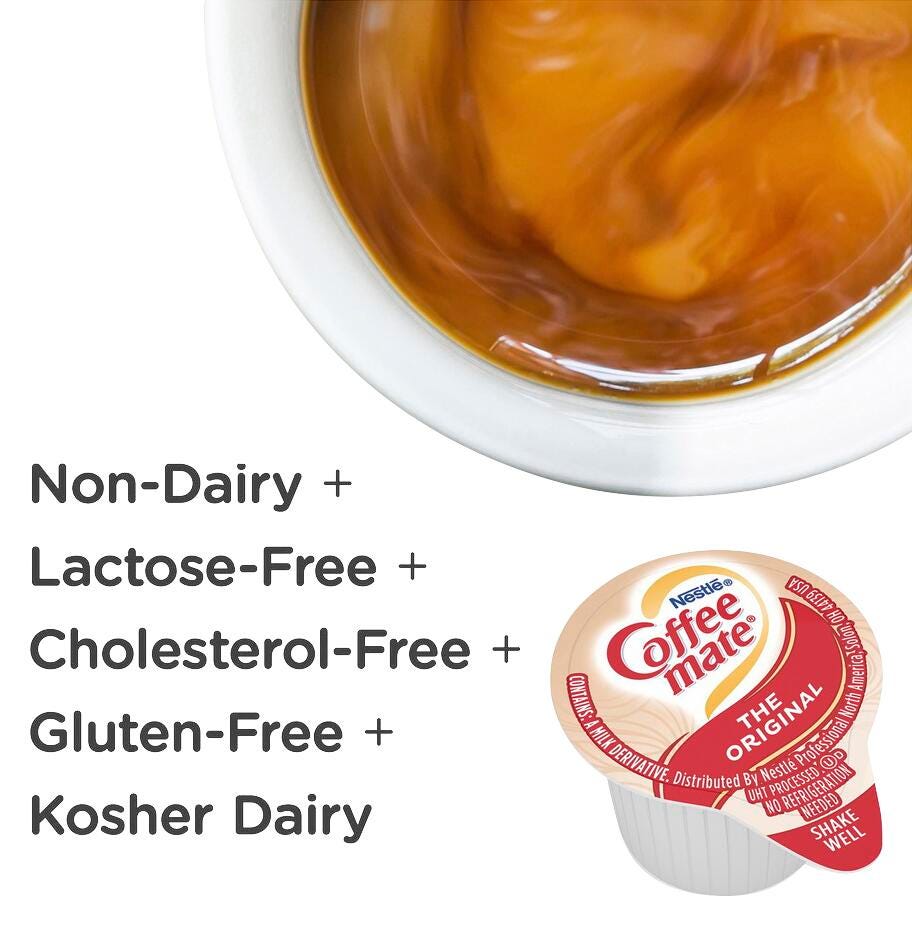 Coffee mate Original liquid creamer singles is a rich and delicious non-dairy creamer that delivers a consistently perfect cup. No refrigeration is necessary. Lactose Free, Gluten Free. One serving is 0.38 ounces each.