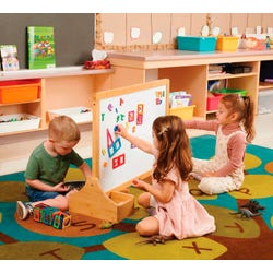 This Early Years Creator Center enables children of multiple ages to play and learn together! It features portrait and landscape orientations, with a magnetic double-sided board and a lower compartment for storage of numbers, letters, and more for children to access on both sides.Features