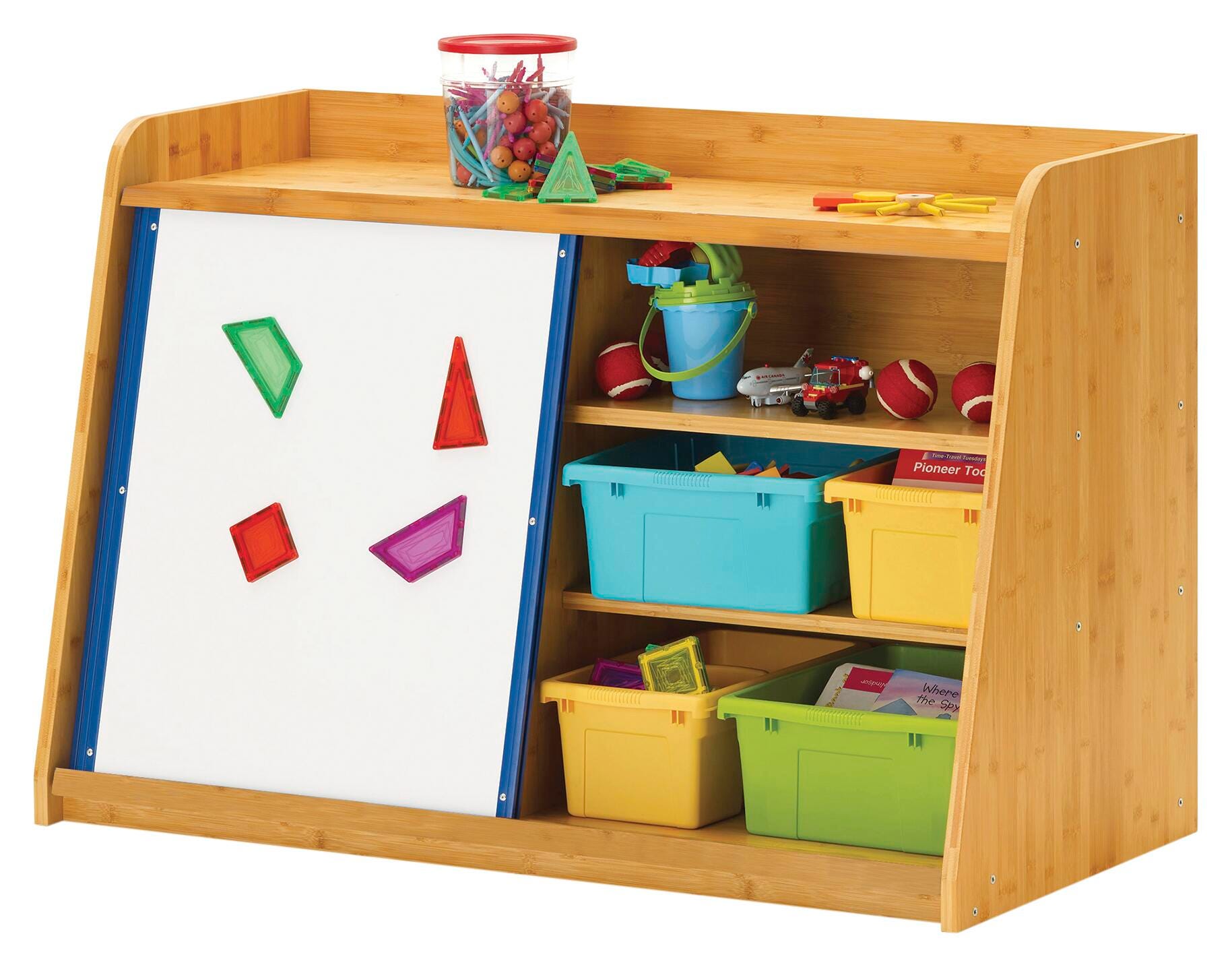 This shelf is both a storage and activity center, the top shelf is at a height that is easily accessible to early childhood students to play, and the three shelves below plus small, divided tubs and large open tubs offer storage for other classroom supplies. The sliding magnetic whiteboard panel is not only a place for creative play, but it also functions as a cover to allow educators to display certain items and supplies and hide when needed.Features