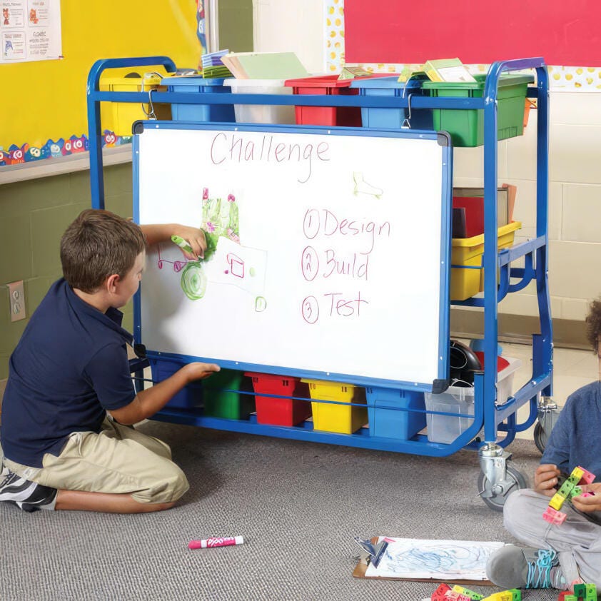 This sturdy cart is designed to provide plenty of storage for making materials, robotics, and manipulatives. The different colored tubs also aid color coding and all the tubs can be removed from the cart. The removable, dry-erase board is perfect for collaboration and sketching out ideas. Measures 51 x 22-1/2 x 40 inches.Features