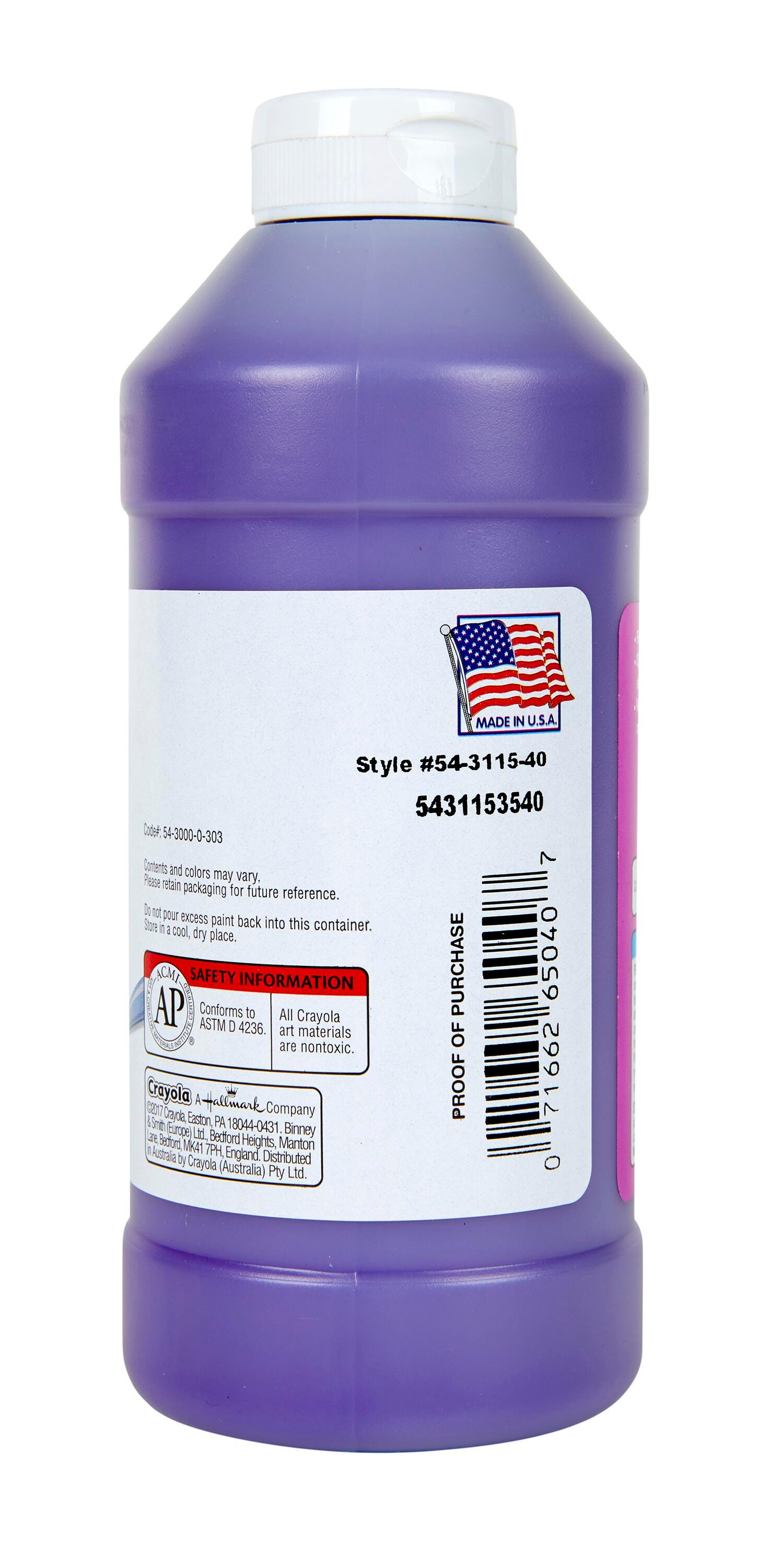 Add a splash of color to art fun anywhere with Crayola Artistia II Washable Tempera Paint. The water-based paint has a creamy consistency that provides good opacity and maximum coverage over newspaper, cardboard, papier mache, traditional paper, and beyond. This rich violet paint can be used on almost any surface, providing a versatile craft solution for class projects, at-home creativity, and arts and crafts activities. The versatile paint is also great for teaching color theory, color mixing, and more.Features