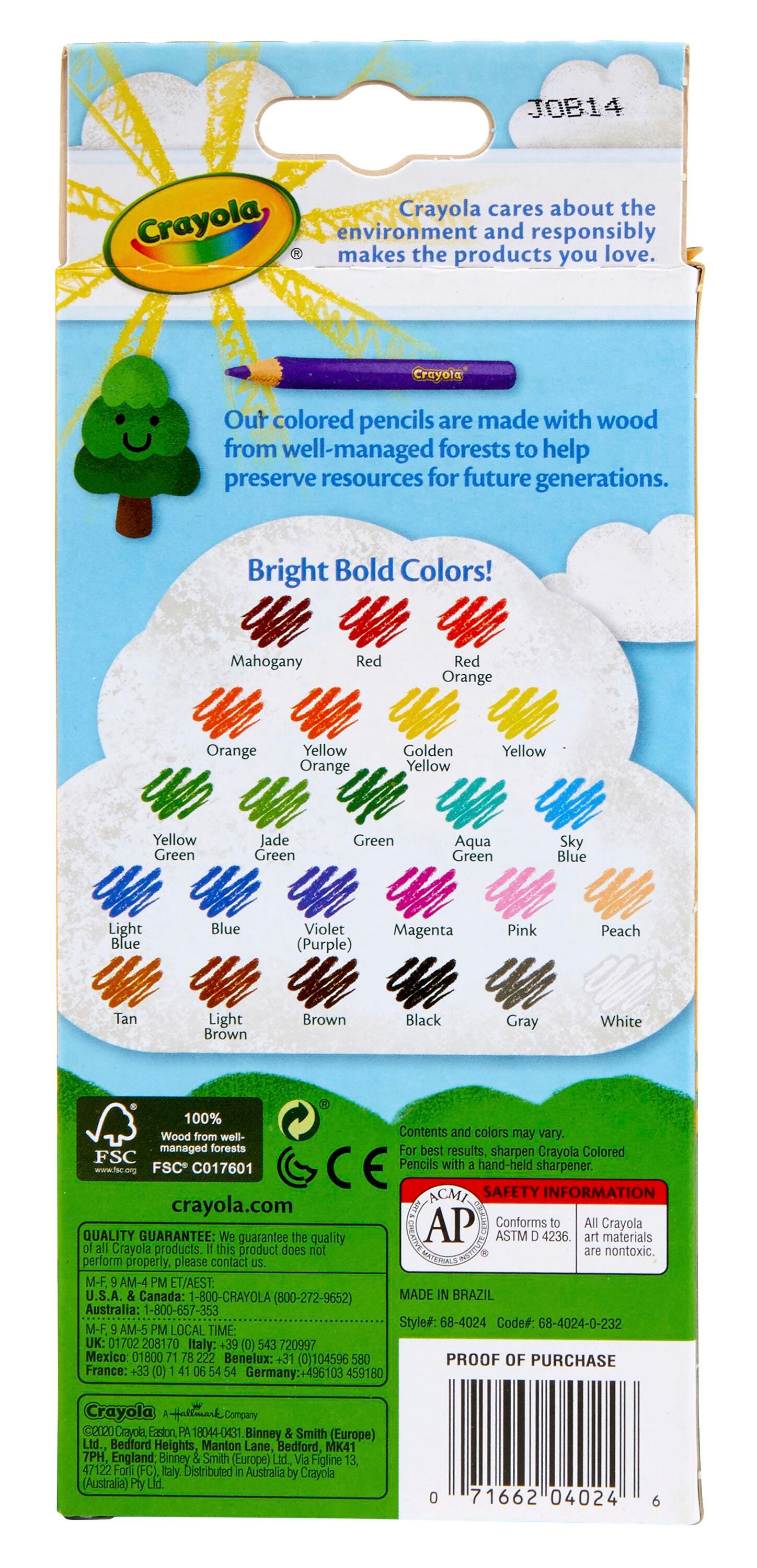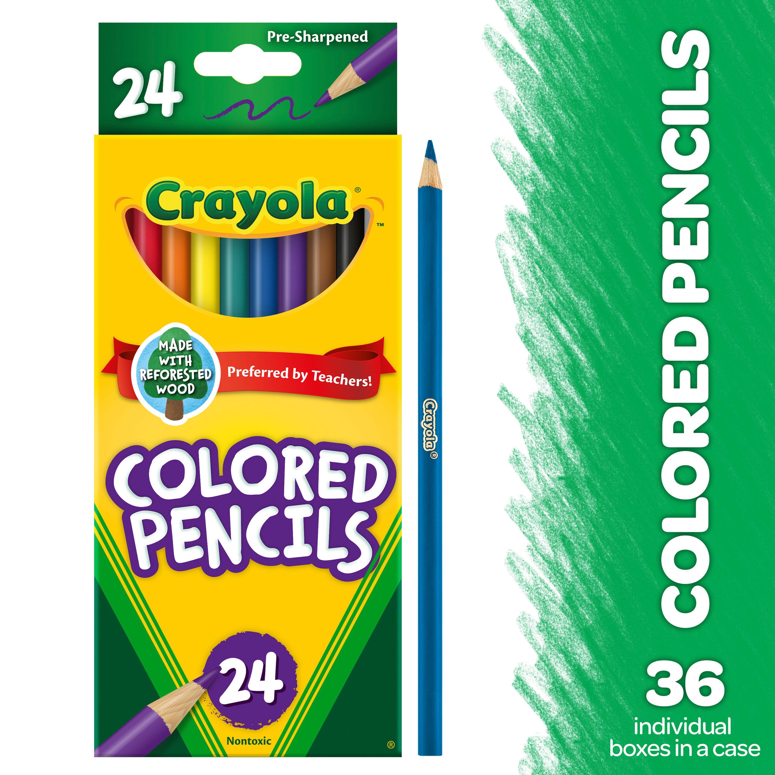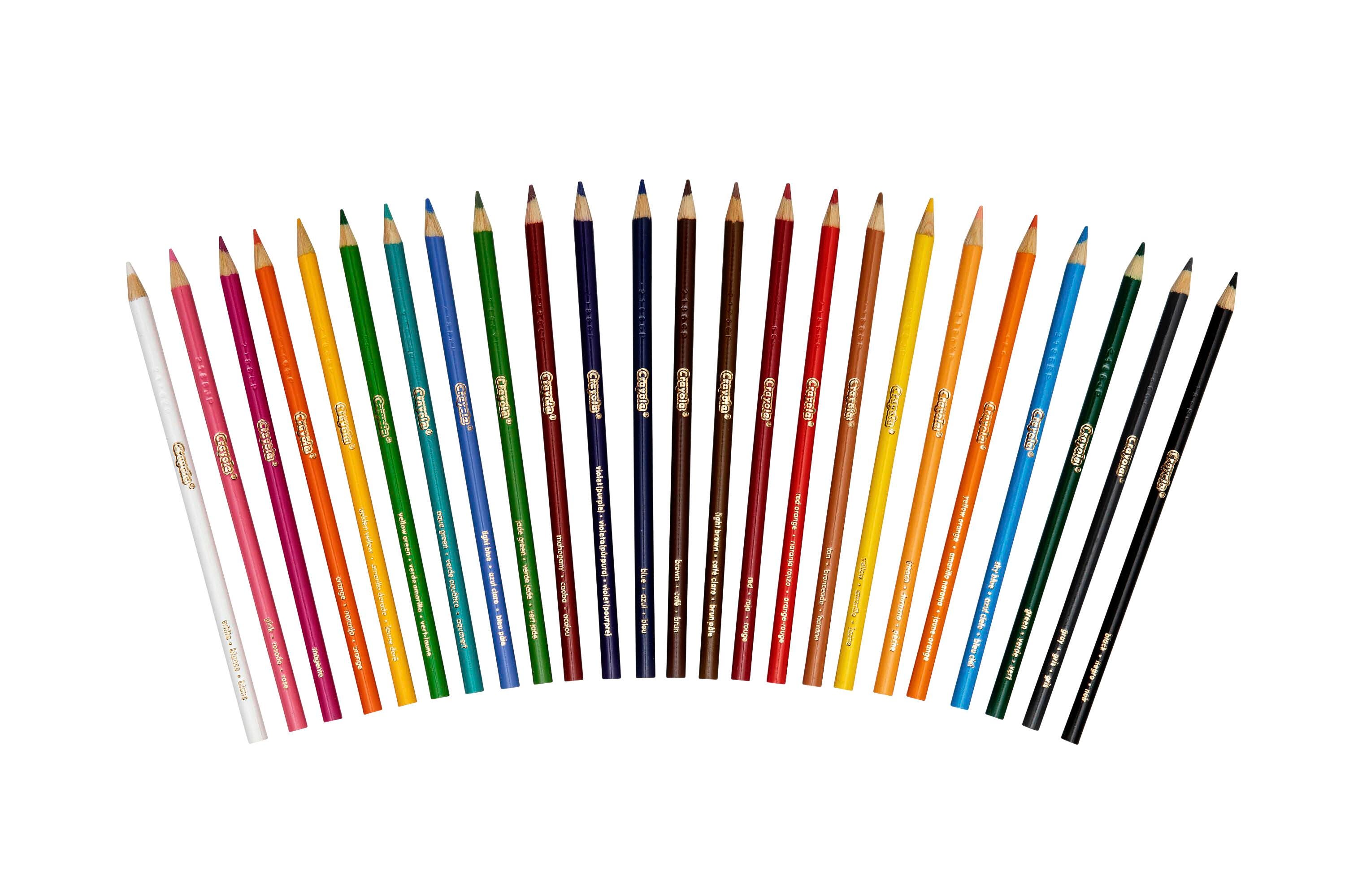 Write, draw, color, and more with this pack of Crayola Colored Pencils. The variety of colors is ideal for practicing more detailed sketching or shading techniques, or color mixing and blending to create new and unique shades. The thick 3-1/3 mm lead tips are soft for laying down smooth, non-scratch color but won't break easily under pressure. This pack contains 24 pre-sharpened colored pencils in the following colors: mahogany, red, red orange, orange, yellow orange, golden yellow, yellow, yellow green, jade green, green, aqua green, sky blue, light blue, blue, violet (purple), magenta, pink, peach, tan, light brown, brown, black, gray, and white.