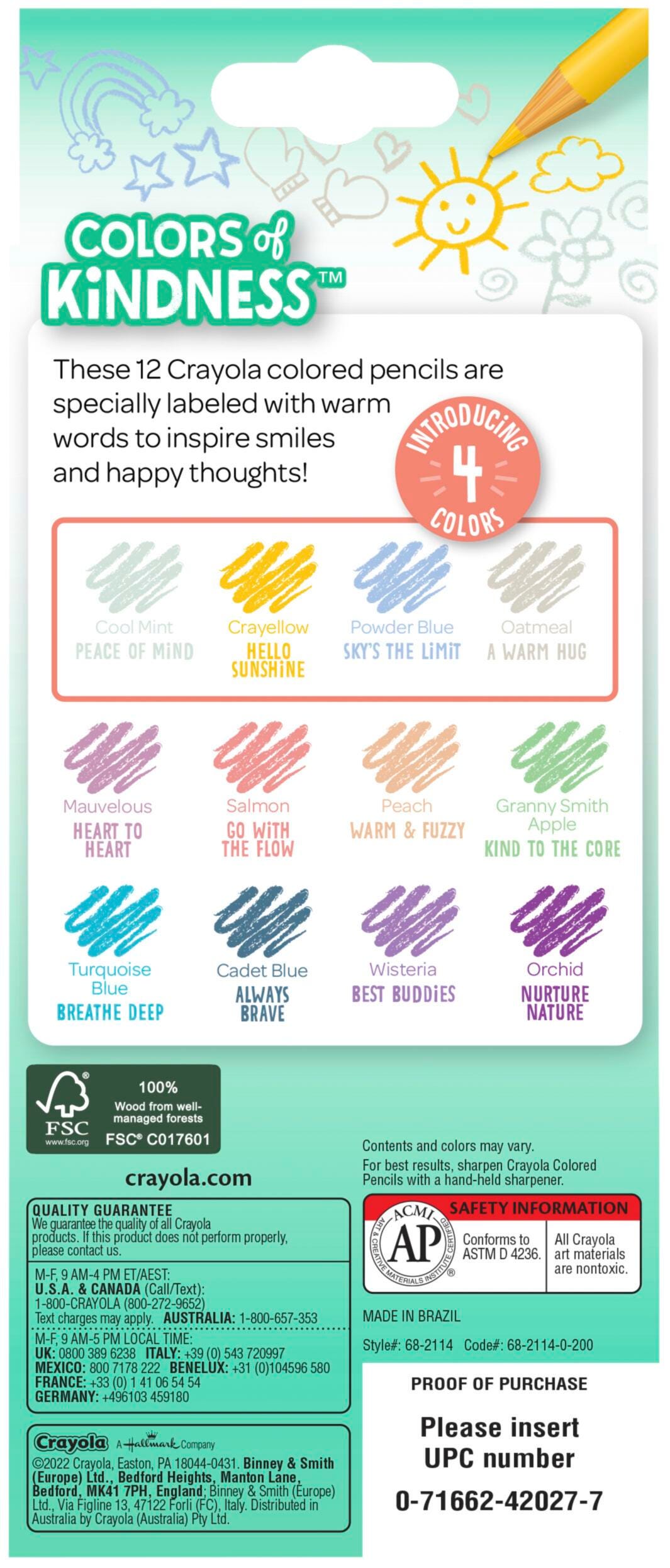 Spread the love with a pack of Crayola Colors of Kindness Colored Pencils. It's the perfect box of coloring supplies for artists who like to live life on the sunny side! This set delivers 12 pre-sharpened colored pencils with special-edition color names that help spread creativity and positivity. Perfect for coloring books, crafting, and art projects, these unique colored pencils are vibrant and made to last. Safe and non-toxic, recommended for ages 5 and up. The set contains 12 colored pencils, 1 each in the following colors: Cool Mint (Peace of Mind), Crayellow (Hello Sunshine), Powder Blue (Sky's the Limit), Oatmeal (A Warm Hug), Mauvelous (Heart to Heart), Salmon (Go With The Flow), Peach (Warm & Fuzzy), Granny Smith Apple (Kind To The Core), Turquoise Blue (Breathe Deep), Cadet Blue (Always Brave), Wisteria (Best Buddies), Orchid (Nurture Nature).Features