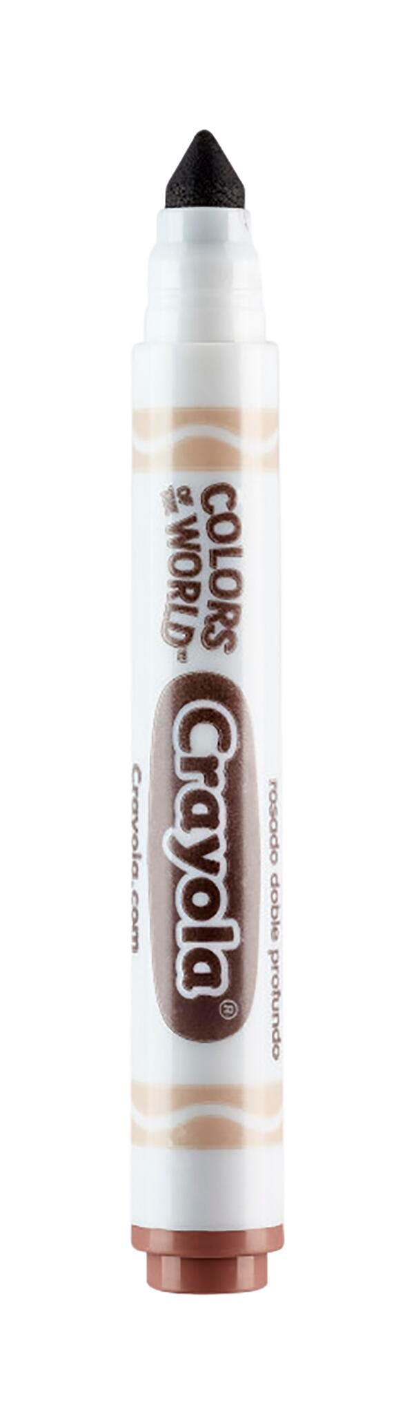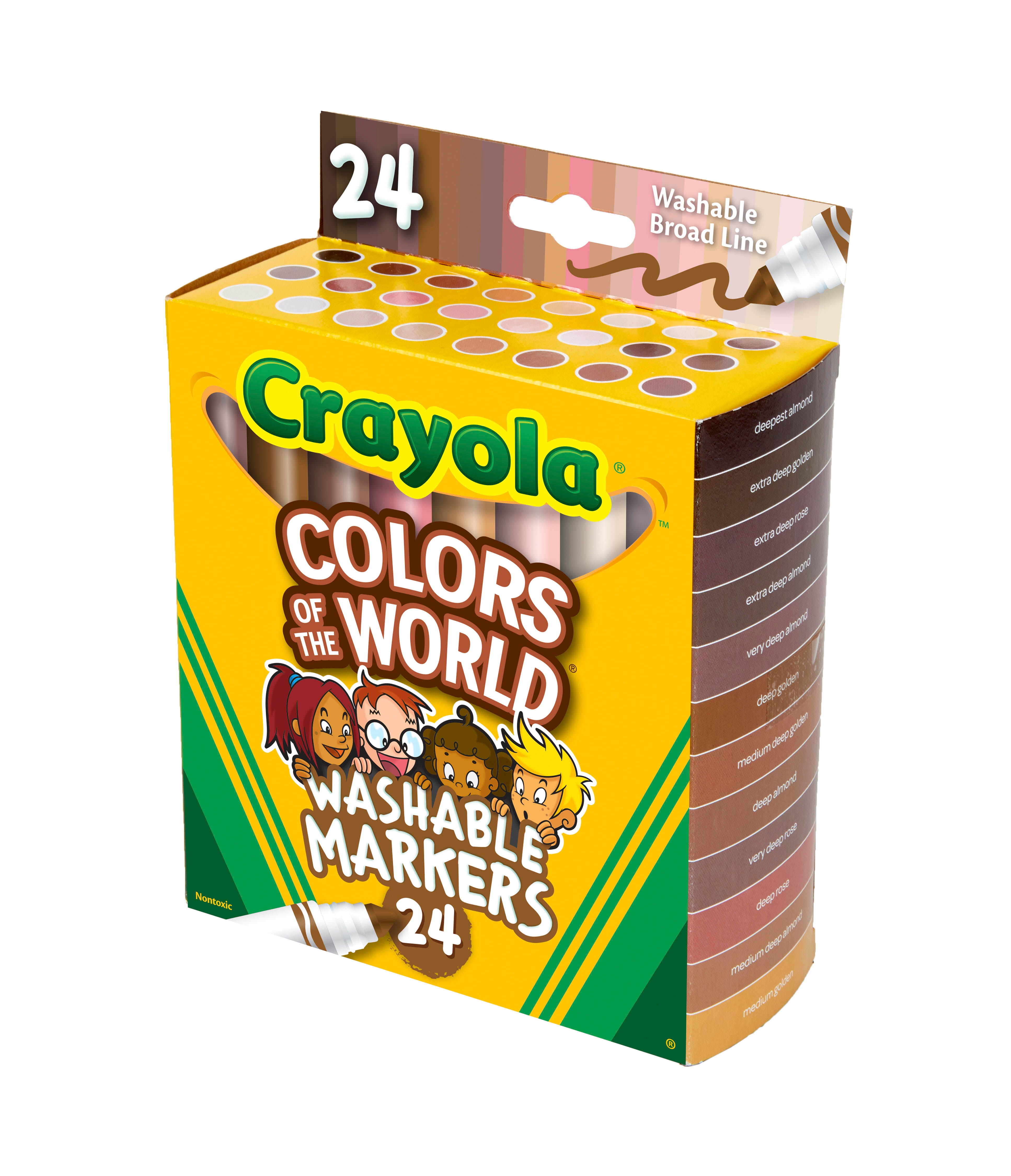 The Crayola Colors of the World Markers are specially formulated to represent people from around the world. The Colors of the World fall into three shades: Almond, Golden, and Rose—and all the darker or lighter shades in between—making it easy for kids everywhere to see themselves in their art! These markers lay down plenty of vibrant color and will not smudge or bleed through paper. The handy washable formula makes sure stray marks and smudges are easy to clean from skin and most washable clothing. This set contains 24 markers in an assortment of colors.Features