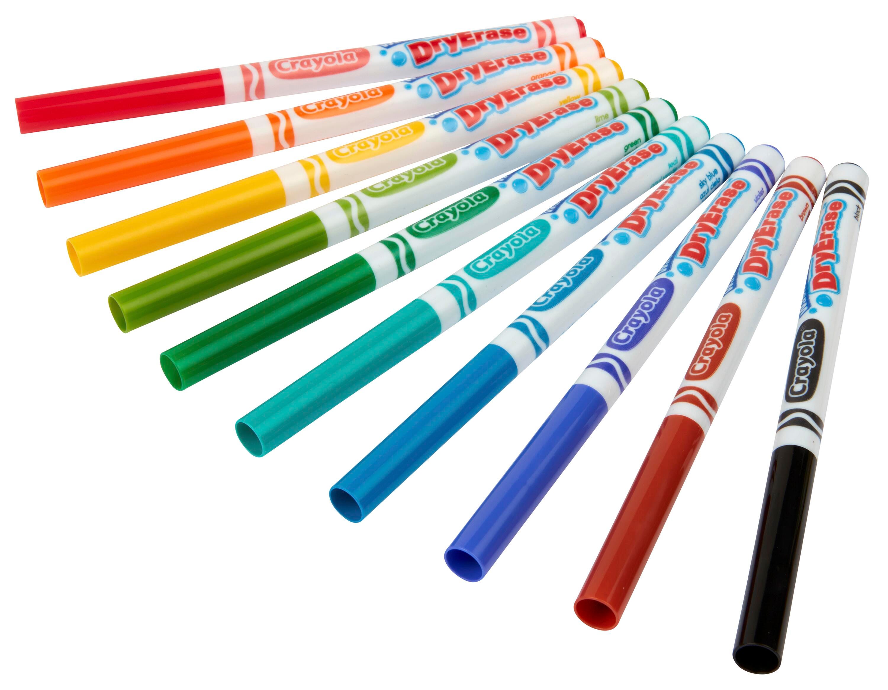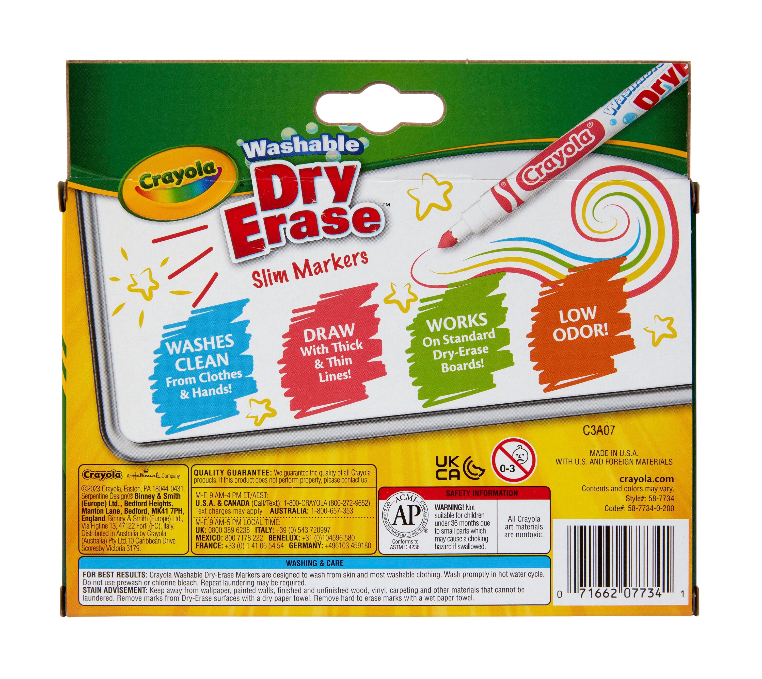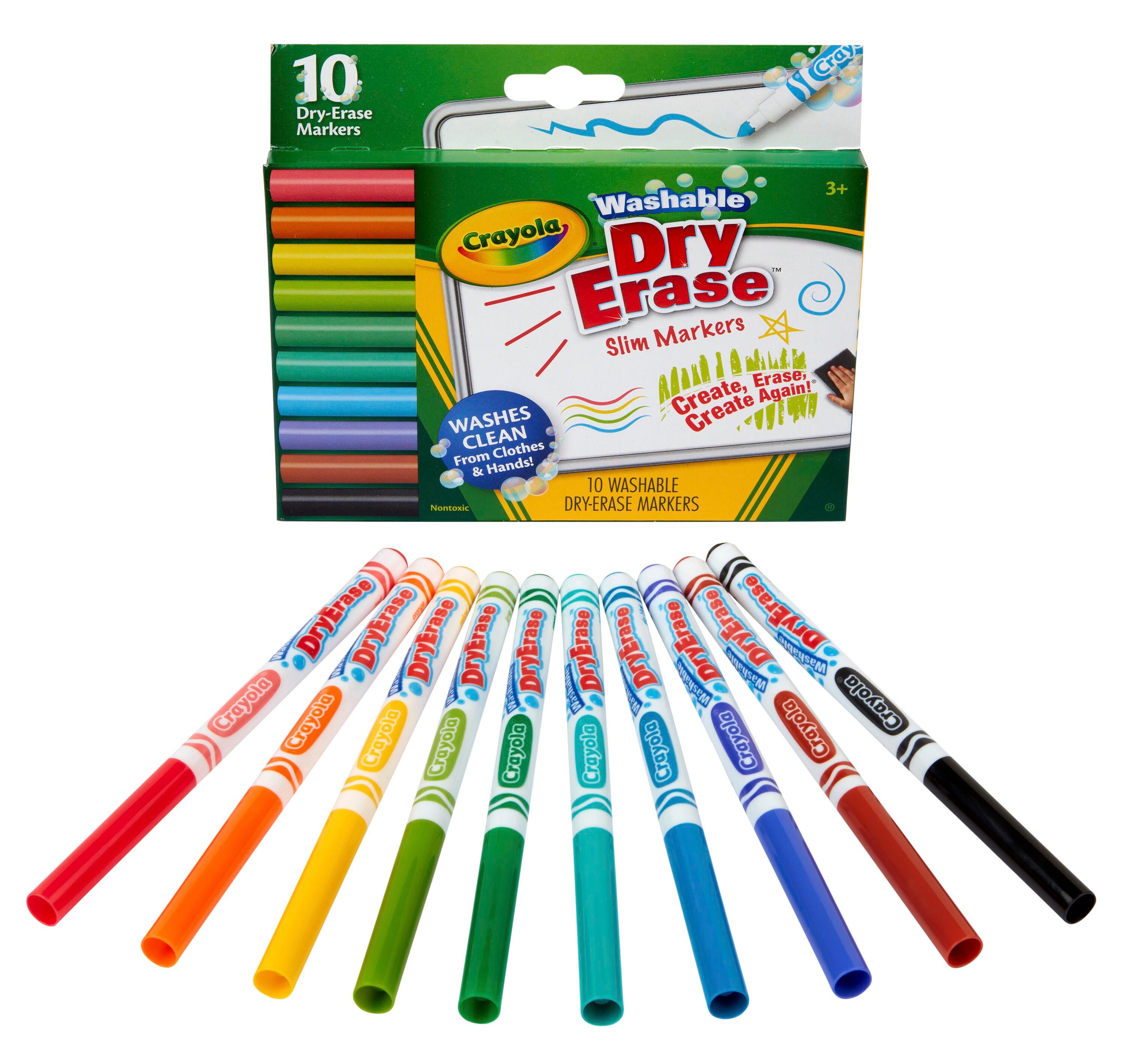 Write, create, erase, and create/write again! From filling in the edges of a graphic to practicing the art of writing letters and numbers, these Crayola Slim Washable Dry Erase markers have your creative and functional needs covered. Slender tips are great for creating fine lines for writing, coloring, or note-taking on dry-erase boards. Safe and non-toxic; ideal for kids ages 3 and up.Features