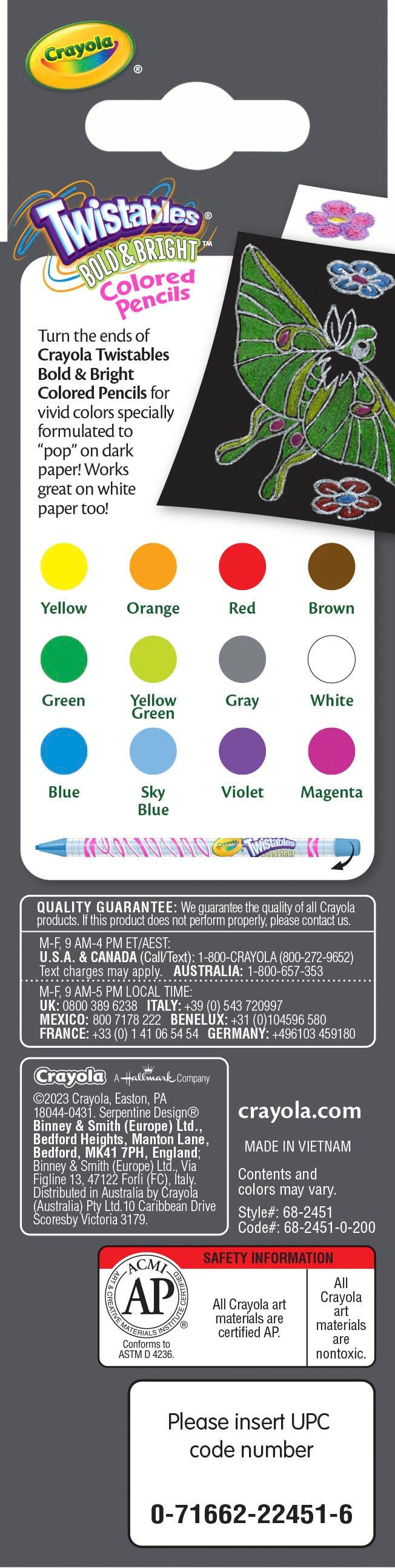 Crayola Twistables Colored Pencils are an easier way to color, and now they are available in Bright & Bold! Twistables Colored Pencils are designed with a sleek, clear plastic barrel body and require no sharpening. Simply twist the barrel to advance the lead, and twist it back to keep the core protected during cleanup. The plastic casing makes it easy to see how much color is left and the size does not change so it's always easy to hold. They are perfect for classrooms and craft rooms, eliminating those tiresome sharpener lines! This set contains 12 colored pencils, 1 in each of the following colors: yellow, orange, red, brown, green, yellow green, gray, white, blue, sky blue, violet, and magenta.Features