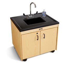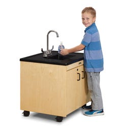 Washing hands is made easy with the Child-Height Clean Hands Helper! Perfect for school, office or home, this setup e Water is heated 20° F by the tankless on-demand water heater. Mistake-proof connectors means the clean and waste water tanks cannot be inadvertently switched around. Plastic sink is approximately 5 inches deep. Quick-connecting hook ups for the tanks have an internal valve to prevent spills when disconnected. Power switch inside the cabinet and openings allow for easy cord management. Plastic top and non-potable, clean water container are made from FDA approved plastic. All electrical components are UL or ETL listed.Child-Height Portable Sink Includes: