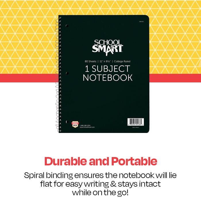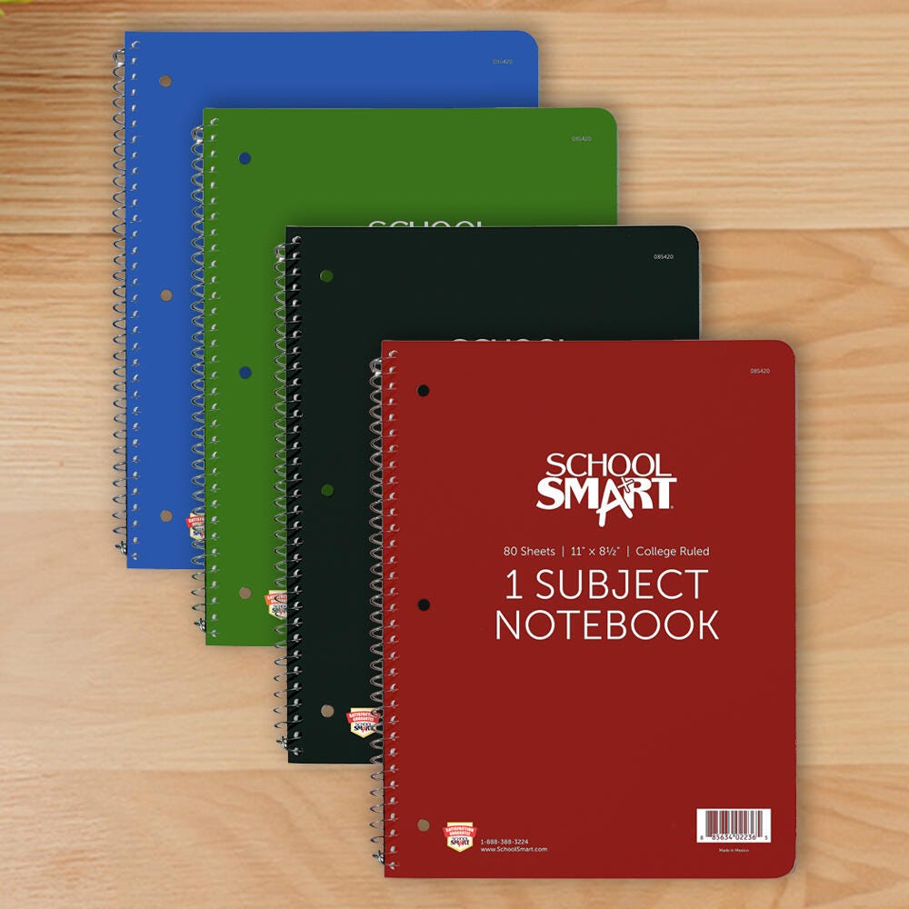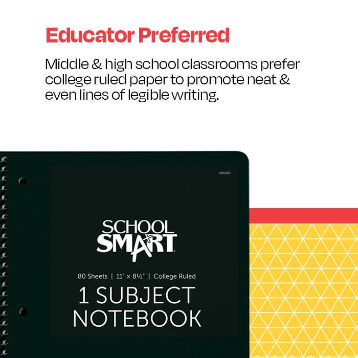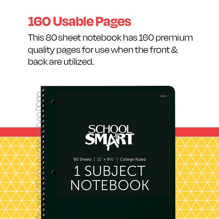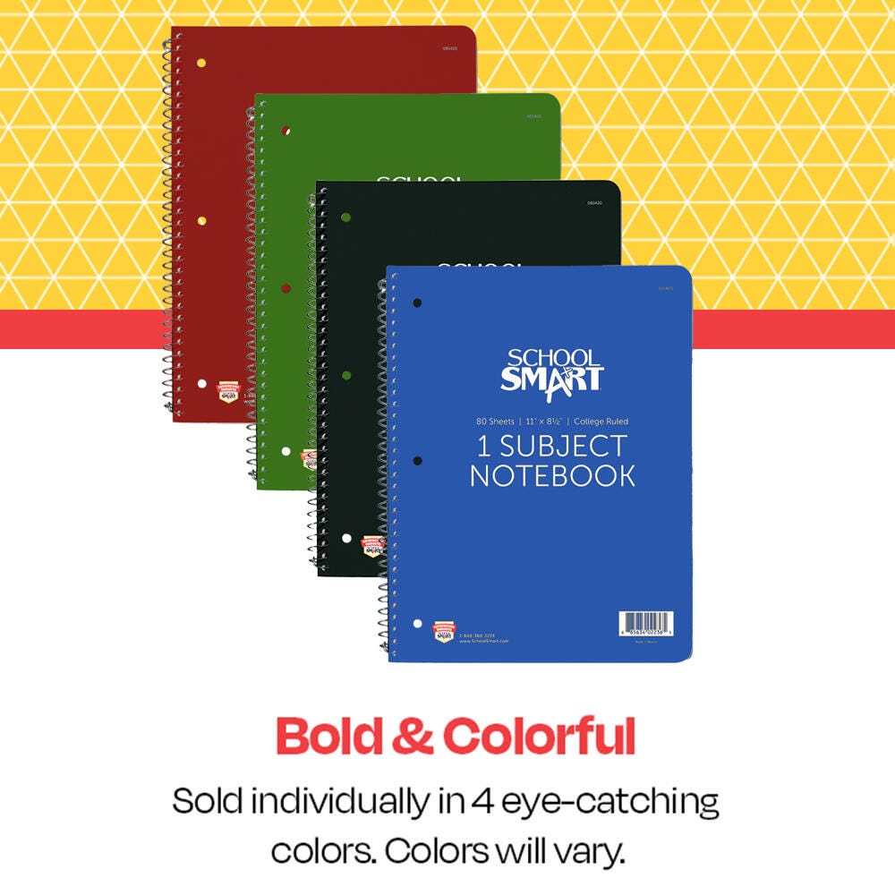 The white, sulphite bond paper of this School Smart notebook offers ruled margins and a 9/32 inch college rule. The 15-pound paper is sturdy and perfect for note-taking or journaling. This one-subject notebook is three-hole punched for simple storage and has 80 sheets/160 pages per book. The color of these notebooks varies and cannot be predetermined.