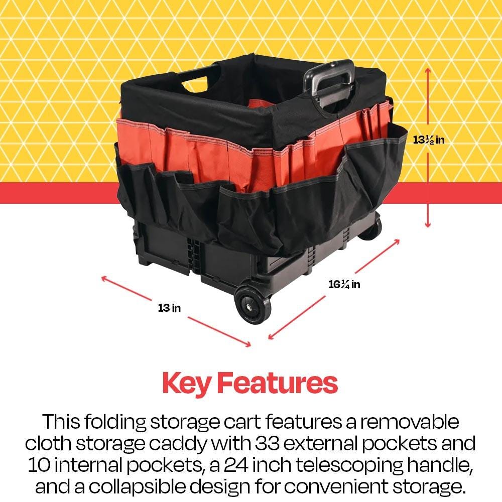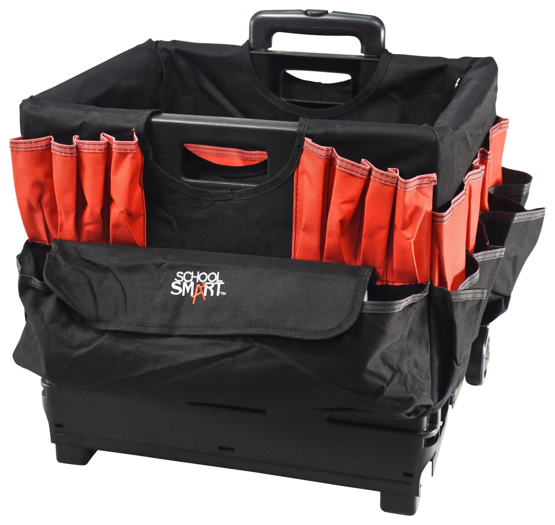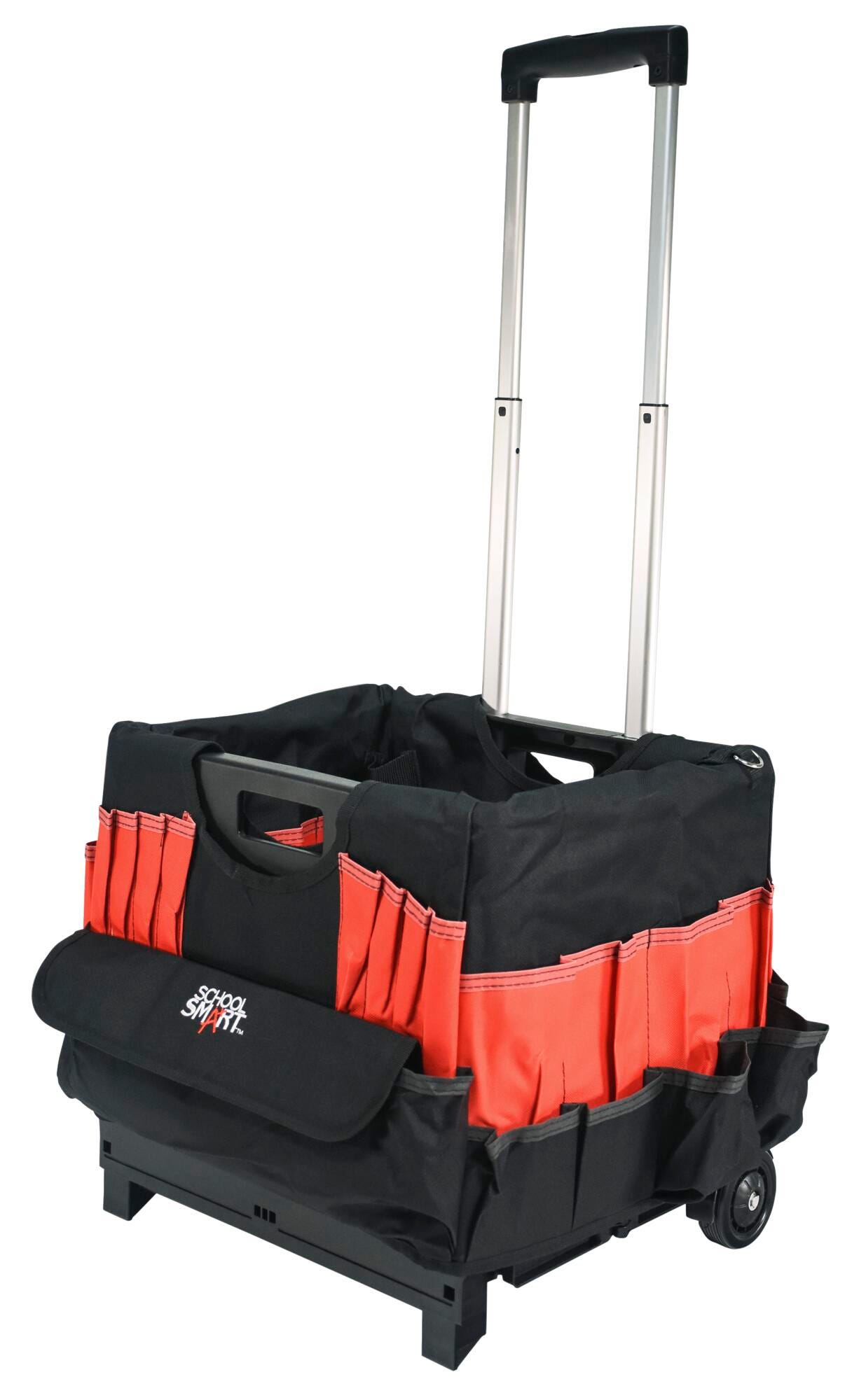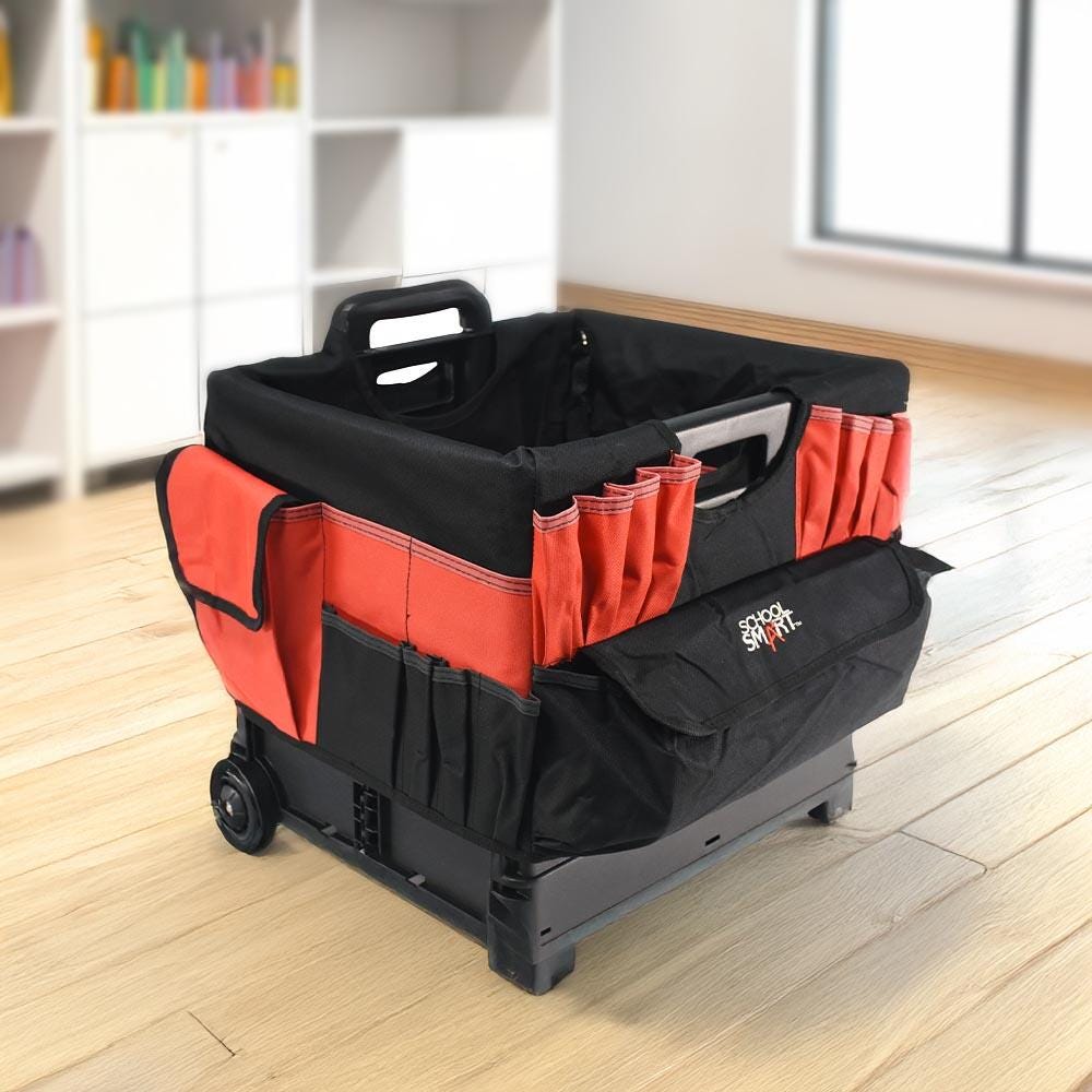 Take education on the go with the School Smart folding storage cart with caddy organizer. The caddy is made of durable fabric that slips over the file cart with ease, featuring various pockets - 33 external pockets and 10 inside pockets. Hold pens, markers, scissors, brushes, and other materials all in one spot. Our large mobile file cart on wheels is specially made for teachers and educators for toting documents, books, supplies, and more. The large-sized educators rolling file cart measures 16-1/4 W x 13 D x 13-1/2 H inches and has a 24 inch telescoping handle. This cart can be reduced to 3-1/4 inches when empty for easy storage. The foldable utility cart comes with polypropylene wheels, so you can take your teaching materials on the go.