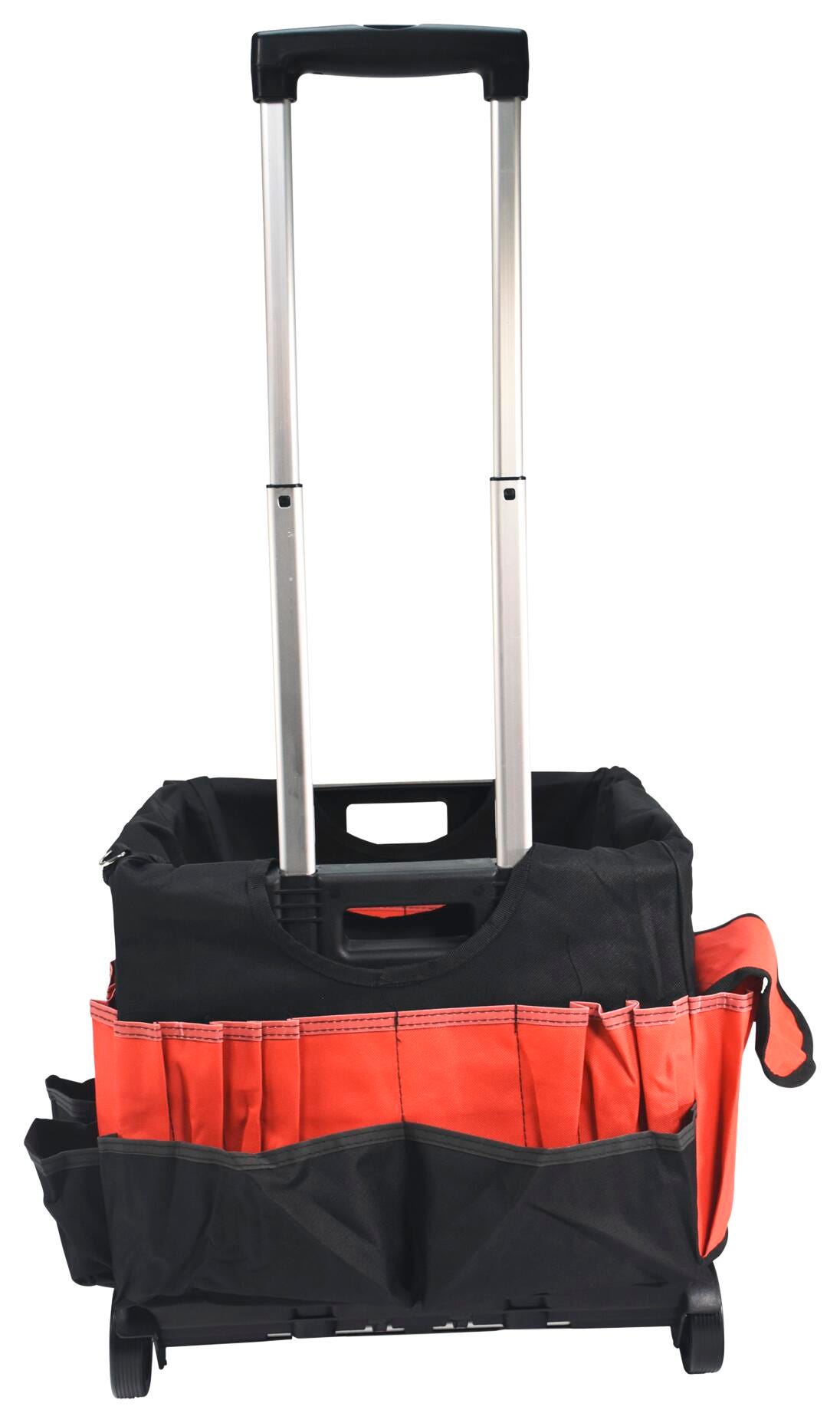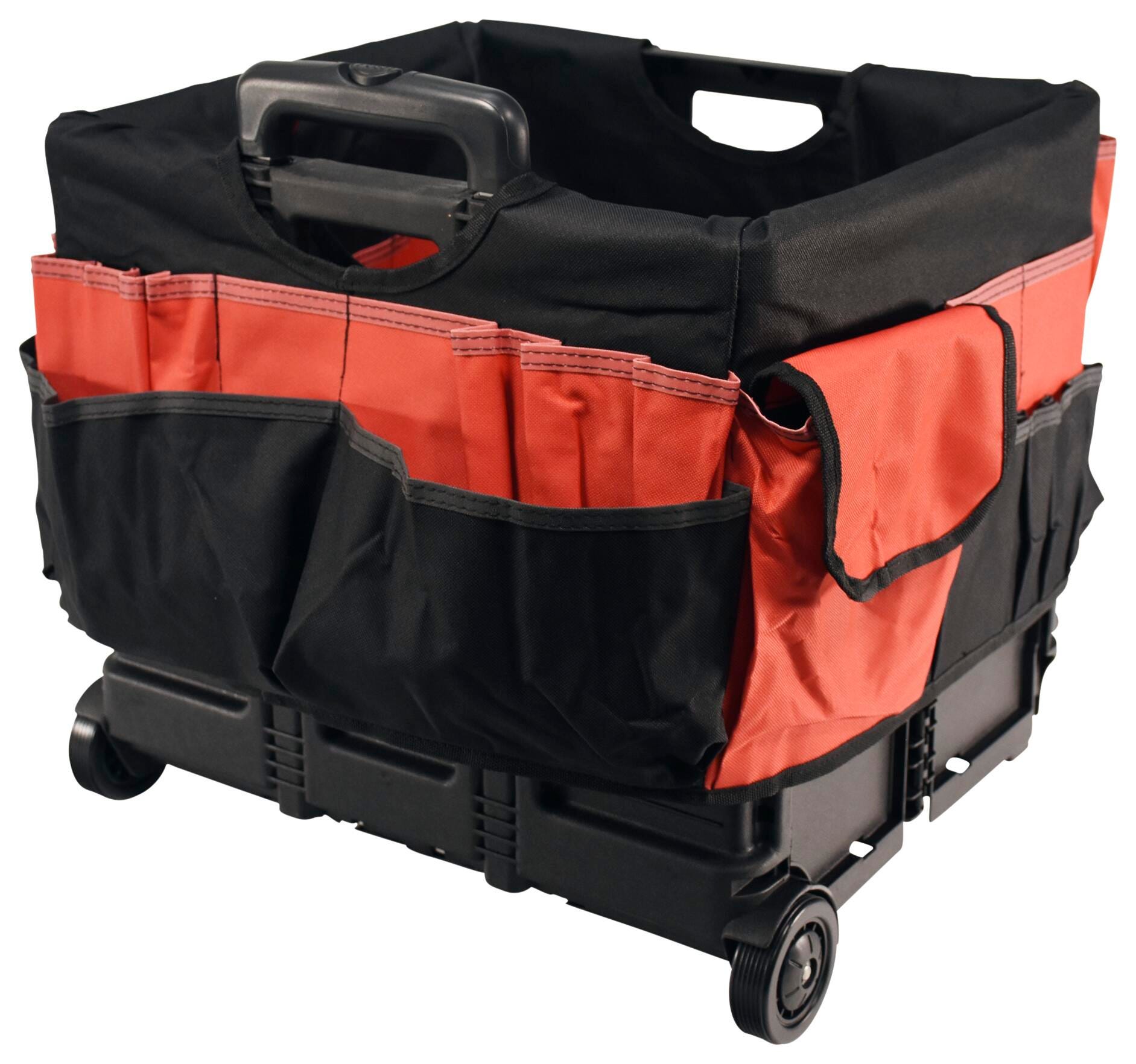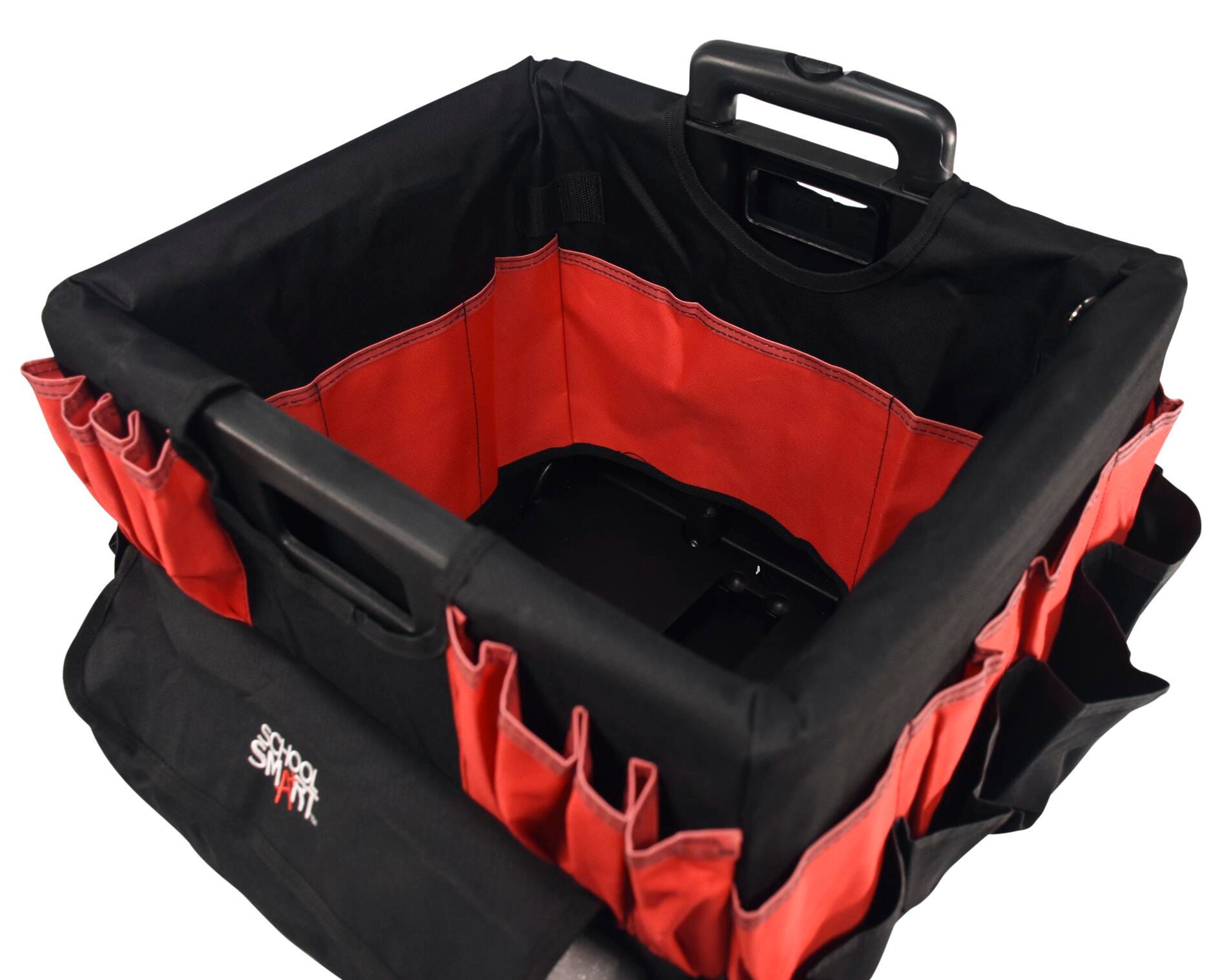 Take education on the go with the School Smart folding storage cart with caddy organizer. The caddy is made of durable fabric that slips over the file cart with ease, featuring various pockets - 33 external pockets and 10 inside pockets. Hold pens, markers, scissors, brushes, and other materials all in one spot. Our large mobile file cart on wheels is specially made for teachers and educators for toting documents, books, supplies, and more. The large-sized educators rolling file cart measures 16-1/4 W x 13 D x 13-1/2 H inches and has a 24 inch telescoping handle. This cart can be reduced to 3-1/4 inches when empty for easy storage. The foldable utility cart comes with polypropylene wheels, so you can take your teaching materials on the go.