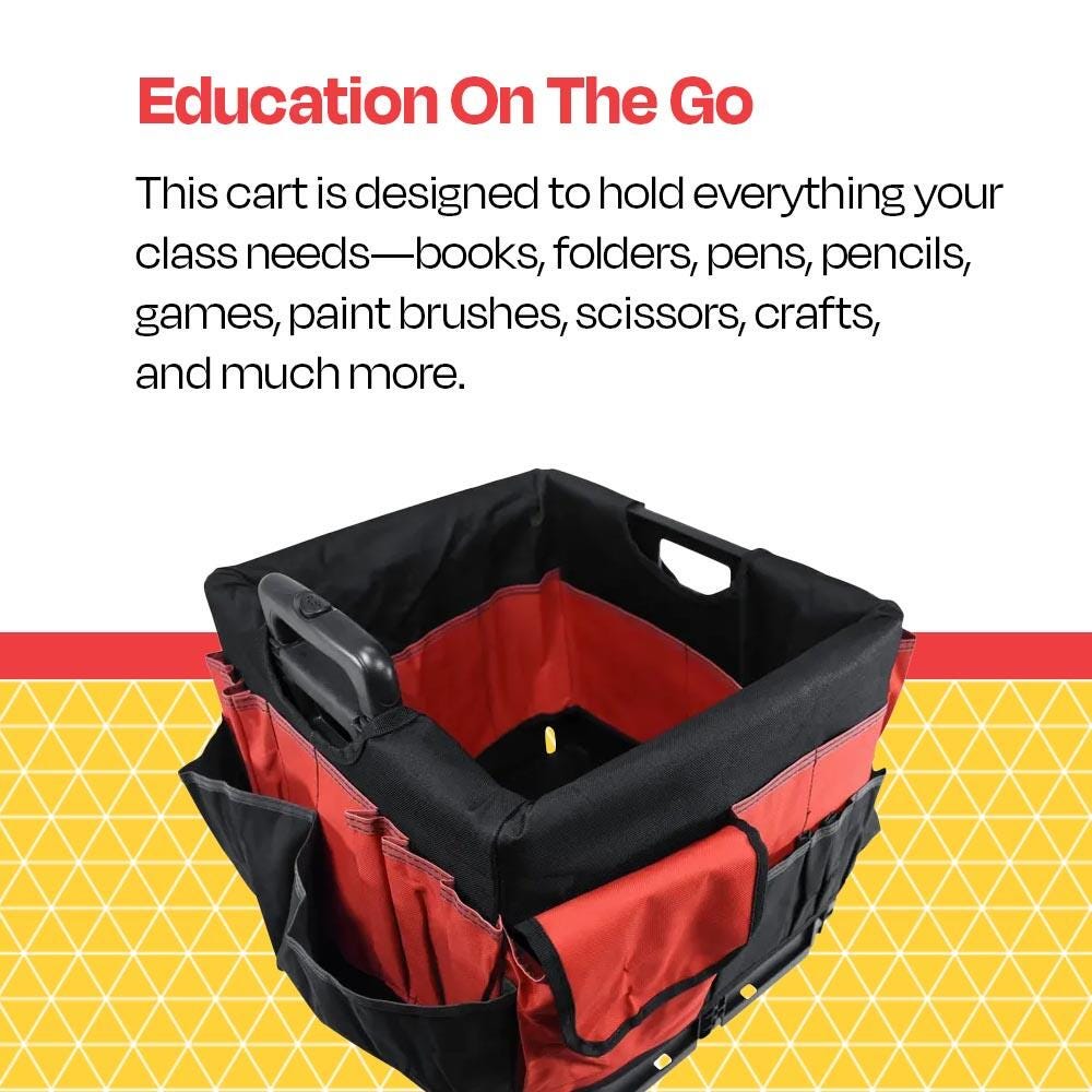 • Foldable utility cart for teachers comes with a convenient fabric caddy organizer to expand storage and organizational capabilities
